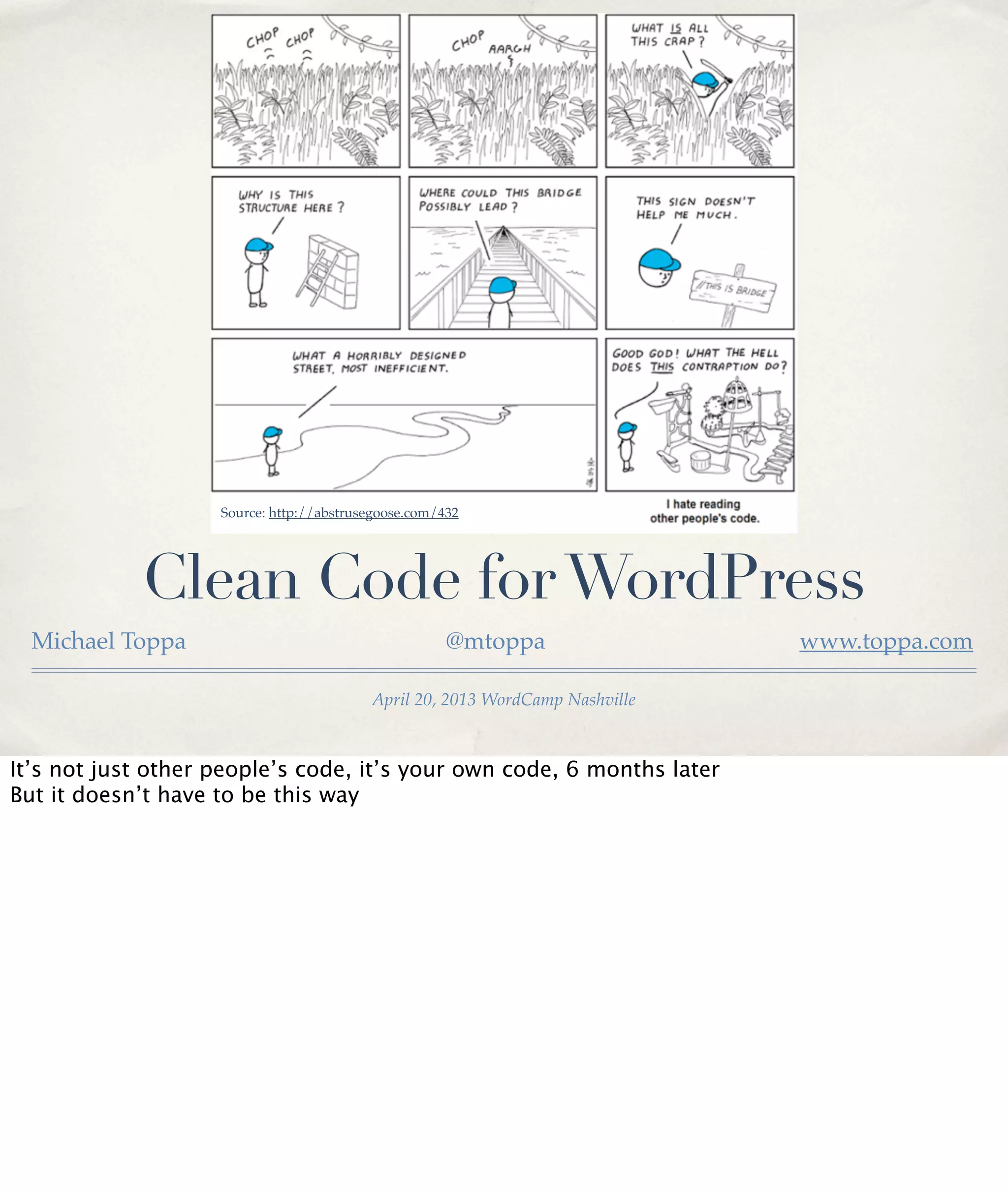 Michael Toppa's presentation at WordCamp Nashville focuses on the importance of clean code in WordPress development, emphasizing principles that promote code organization, clarity, and maintainability. He discusses key practices such as meaningful naming, writing expressive code, and the significance of adhering to professional standards to avoid code becoming unmanageable. Toppa argues for the necessity of developing clean code habits to enhance flexibility and speed in software development while preventing complications down the line.