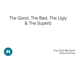 The document discusses different types of content on a spectrum from good to superb. It identifies traits of good, bad, ugly, and superb content. Good content is informative, shareable, and of proper length while bad content is vague, self-serving, and lacks focus. Ugly content is overly promotional and lacks purpose. Superb content helps others, moves metrics, and is shareable. Tips for creating superb content include knowing your audience, measuring performance, being prepared to fail, and reviewing/refining content.