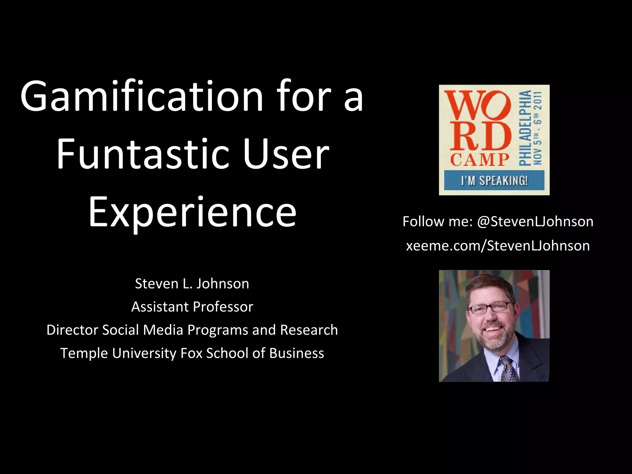 This document discusses using gamification to enhance user experience. It provides the example of gamification elements like achievements, points, badges and leaderboards being used in a university course to motivate student participation. It outlines benefits of gamification like fun, focus, and tapping multiple motivations. The document concludes that thoughtful gamification can be effective and there are multiple WordPress plugin options available.