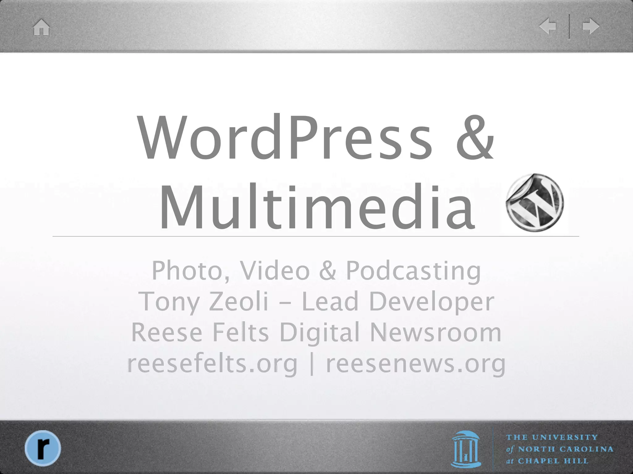 The document provides an extensive overview of WordPress multimedia capabilities, including upload limits for media types such as images, audio, and video. It discusses various plugins for galleries, video players, and podcasting, along with configuration settings and compatibility issues related to Flash and HTML5. Contact information for the lead developer, Tony Zeoli, is included, emphasizing collaboration in digital media projects.