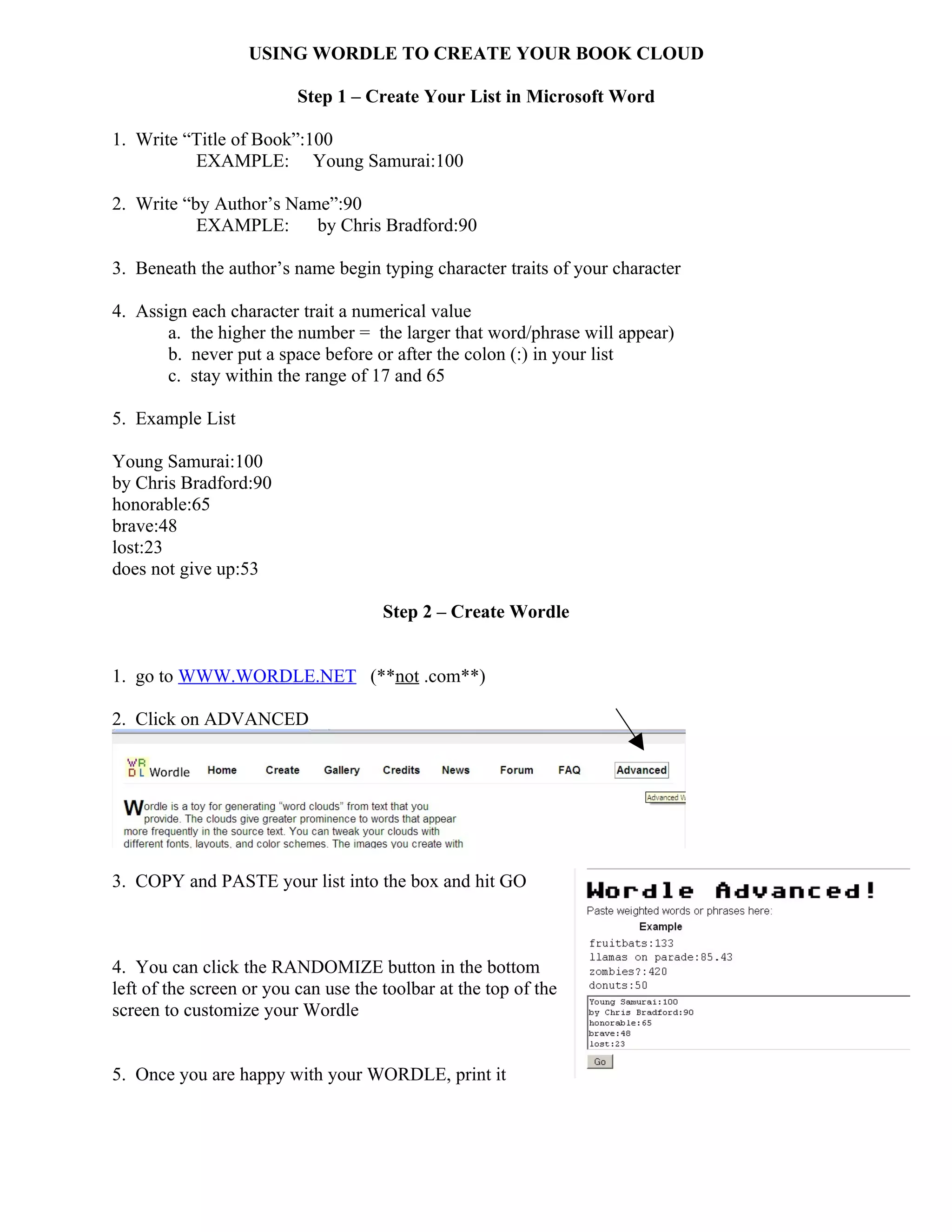 This document provides instructions for creating a book cloud using Wordle. It involves creating a list in Microsoft Word with the book title, author, and character traits assigned numerical values. This list is then copied into Wordle.net to generate a visual representation of the words with the font size determined by the assigned values. The Wordle can then be customized and printed.