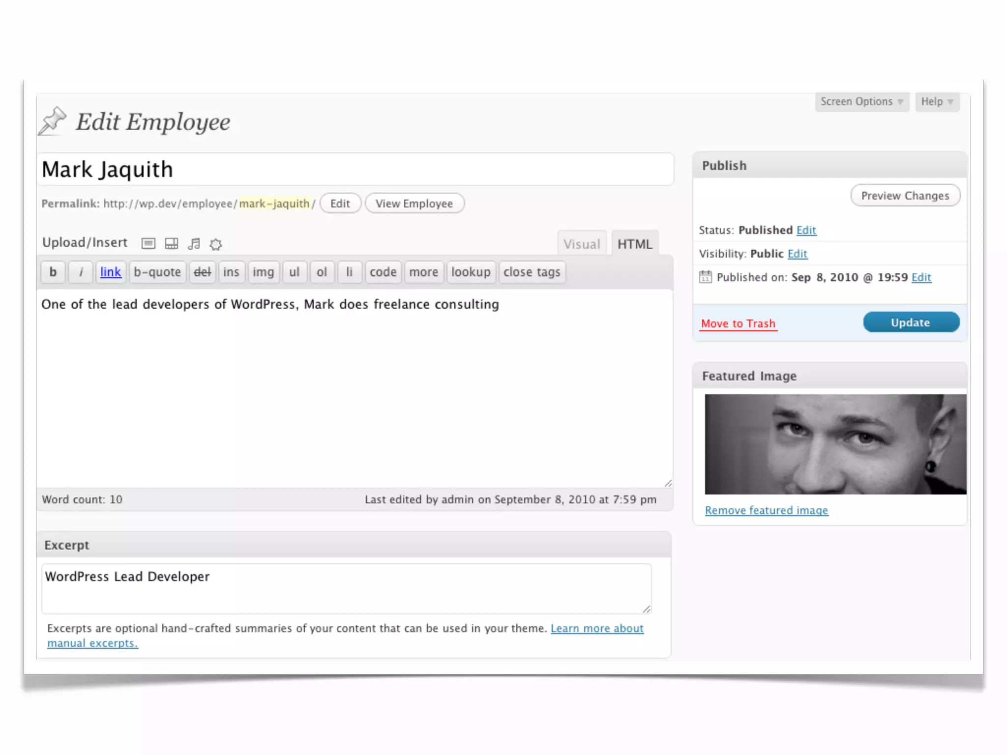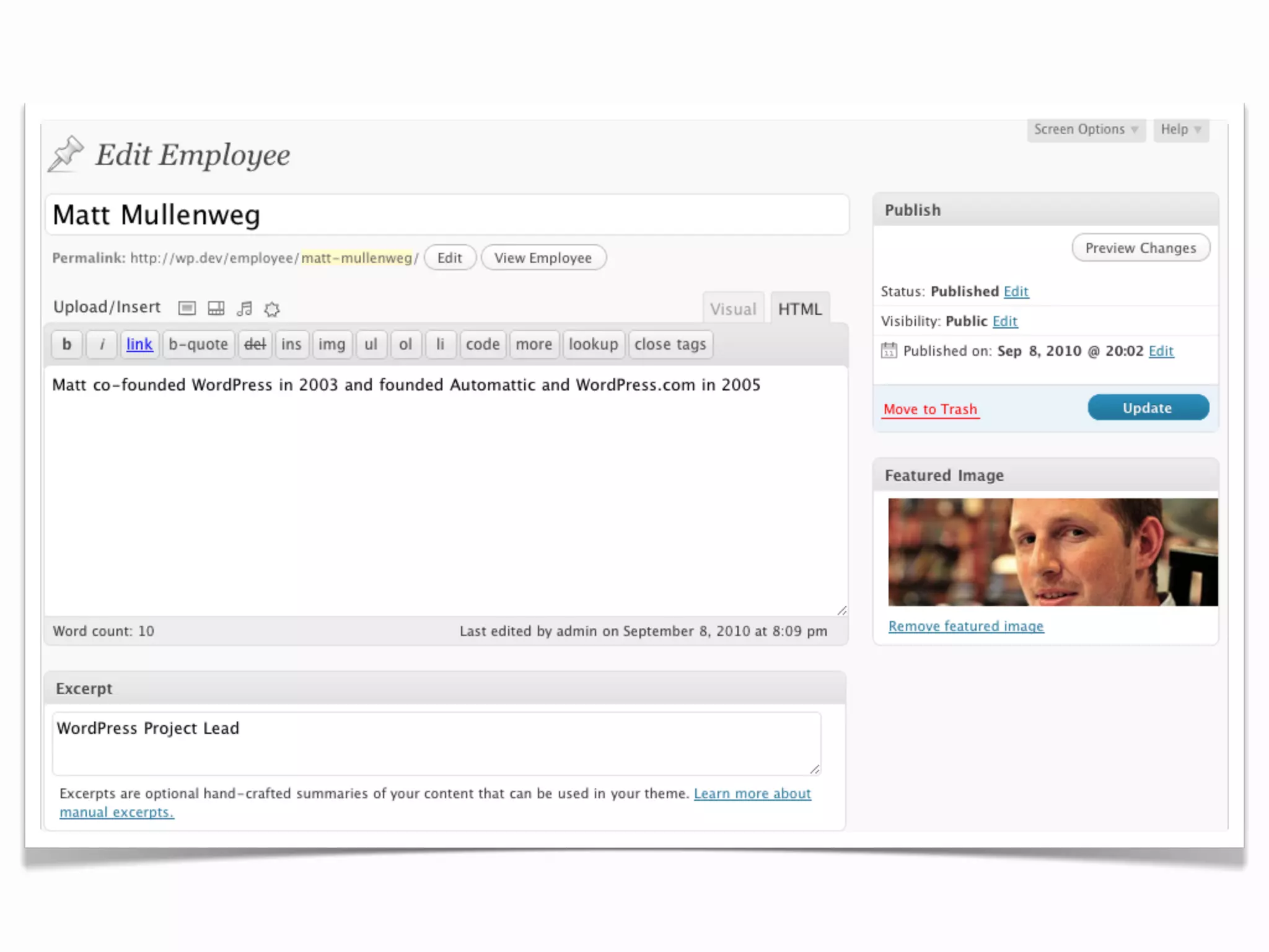 [employee] shortcode](https://image.slidesharecdn.com/custom-post-types-100908162819-phpapp02/75/WordPress-Custom-Post-Types-18-2048.jpg)