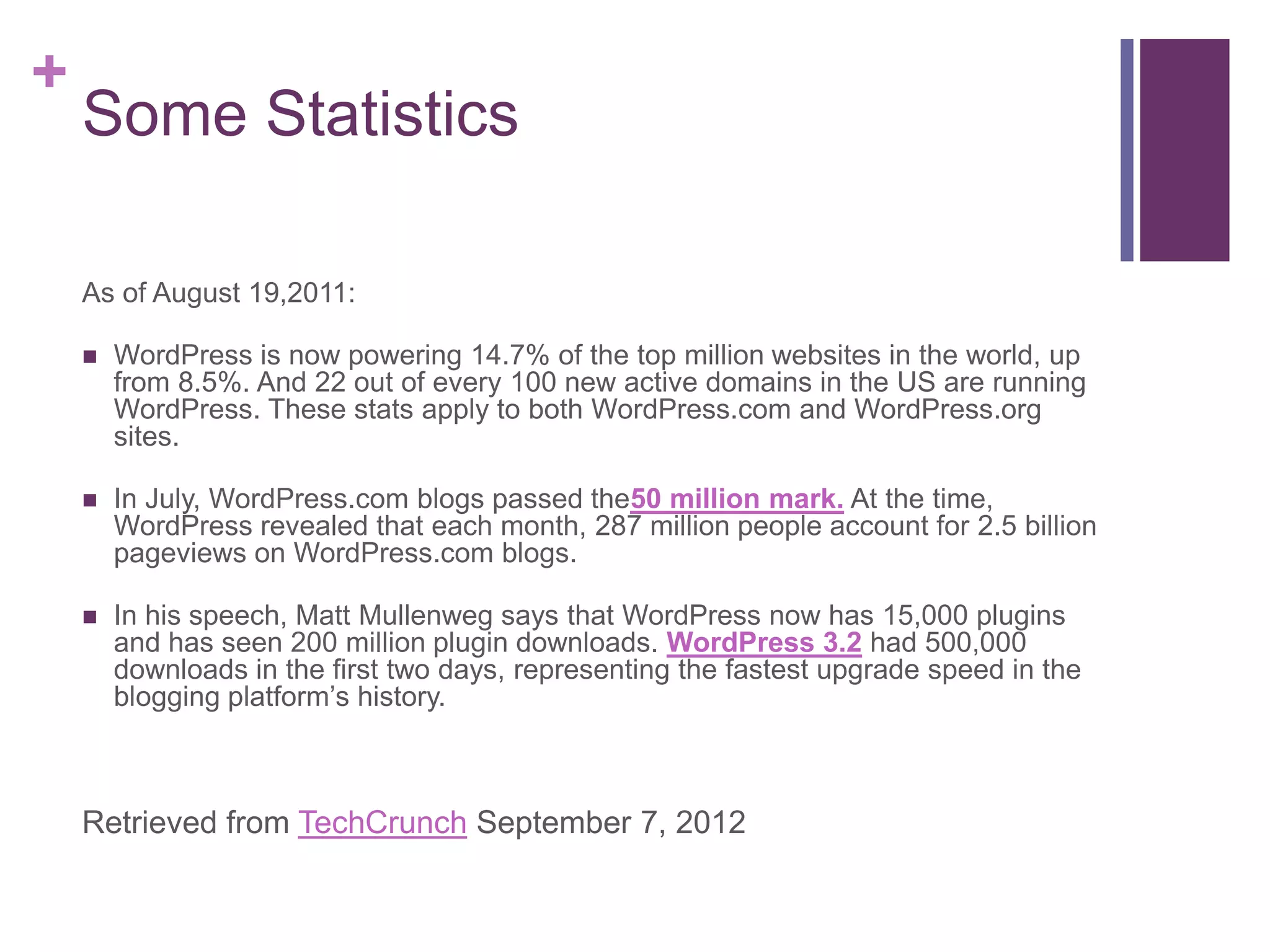 WordPress is now powering over 14% of websites and has over 50 million blogs on WordPress.com. It has 15,000 plugins that have been downloaded over 200 million times. WordPress.org allows more customization than WordPress.com and users have their own domain, while WordPress.com users are limited in customization but have an address with WordPress in the domain. Major publications like the Huffington Post and CNN use WordPress because it is customizable, allows multiple users/domains, has built-in SEO and analytics, and has a large community of resources.