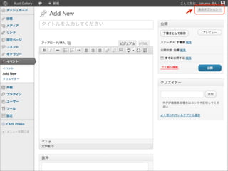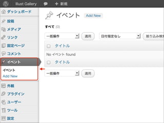 { register_post_type( 'event', array( 'label' => 'イベント', 'public' => true ) ); } add_action( 'init', 'create_post_type' ); または