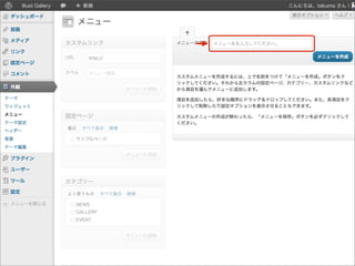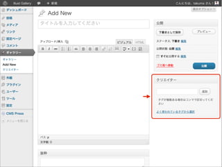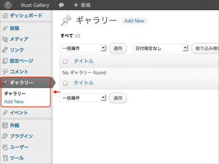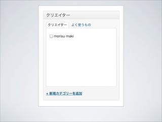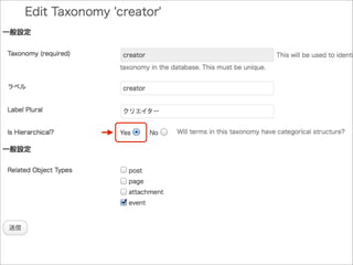 { register_taxonomy( 'creator', 'gallery', array( 'label' => 'クリエイター', 'public' => true ) ); } add_action( 'init', 'create_taxonomy' ); または