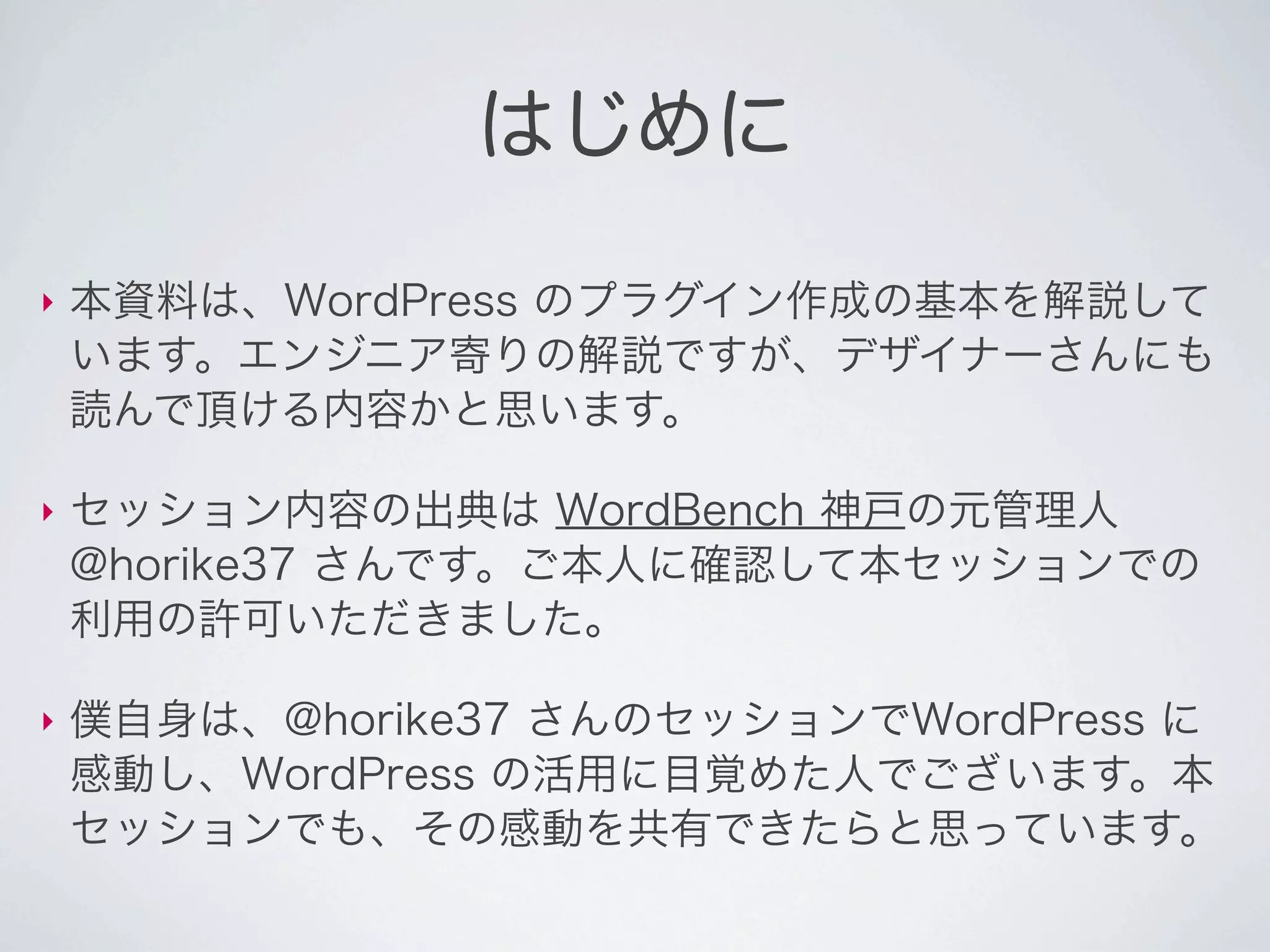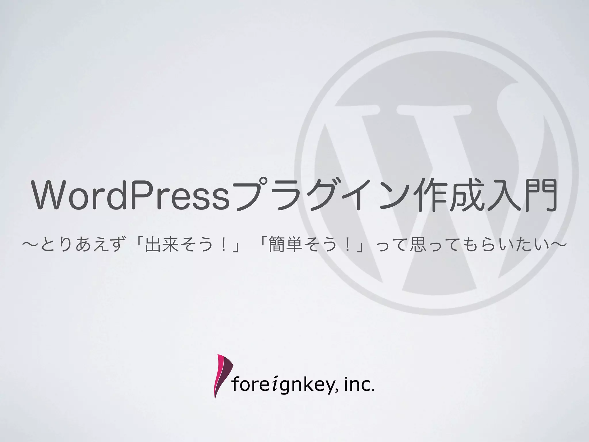 本資料は、WordPress のプラグイン作成の基本を解説しています。エンジニア寄りの解説ですが、デザイナーさんにも読んで頂ける内容かと思います。 セッション内容の出典は WordBench 神戸の元管理人 @horike37 さんです。ご本人に確認して本セッションでの利用の許可いただきました。 僕自身は、@horike37 さんのセッションでWordPress に感動し、WordPress の活用に目覚めた人でございます。本セッションでも、その感動を共有できたらと思っています。