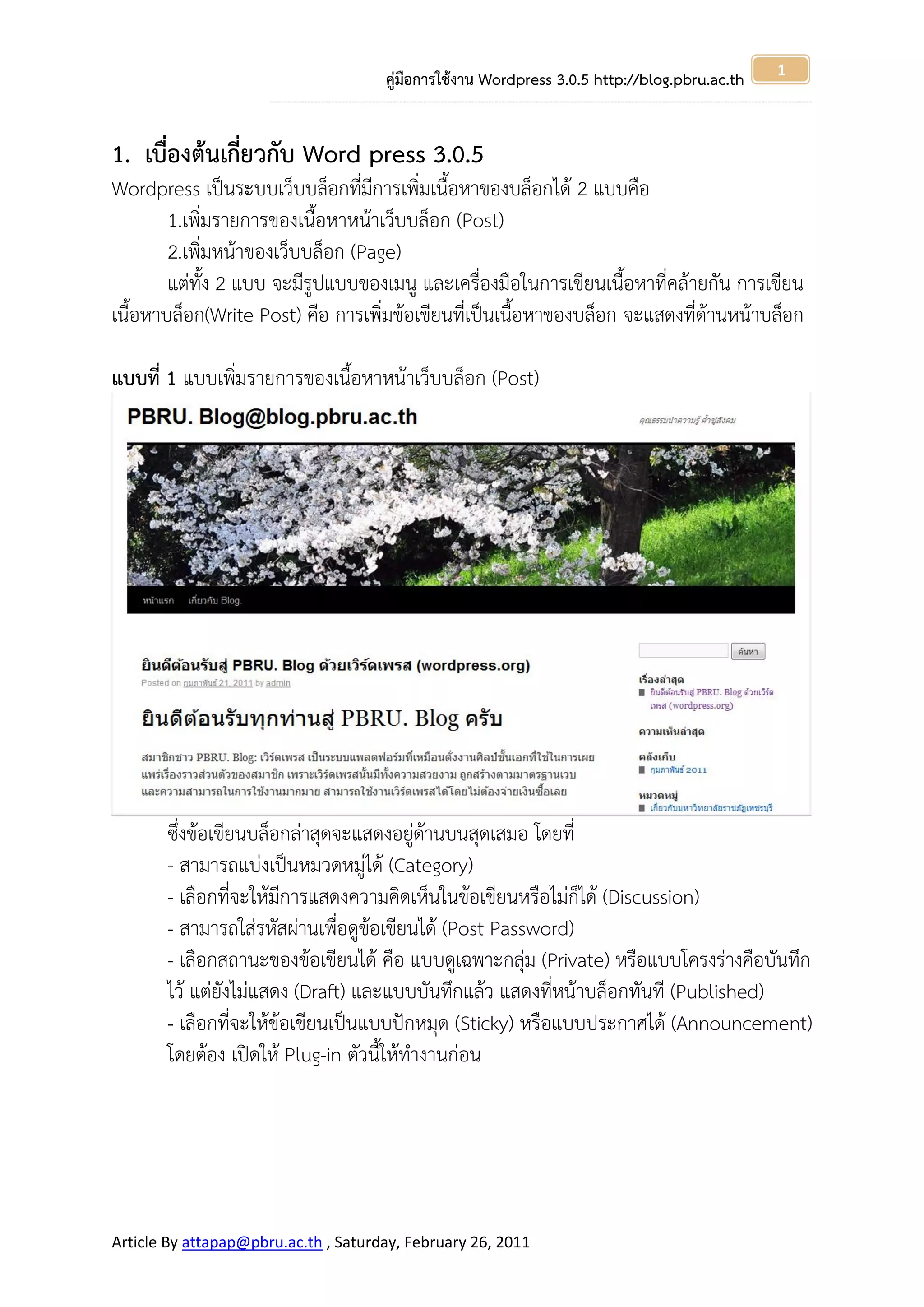 คู่มือการใช้งาน Wordpress 3.0.5 http://blog.pbru.ac.th