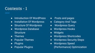 Wordpress is an open source content management system that allows users to build dynamic websites and blogs. It has features like multi-lingual support, SEO, user management and media management. Popular themes include Divi, Ultra and Avada. Popular plugins include WooCommerce, Contact Form 7, SEO plugins and security plugins. Posts are individual pieces of content with dates, categories and tags while pages are static blocks without those attributes. Wordpress uses hooks, queries, widgets and shortcodes to extend functionality. Optimization techniques include updating software, using caching plugins, image optimization and .htaccess modifications.