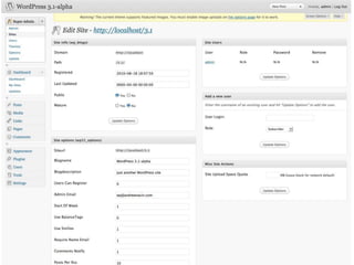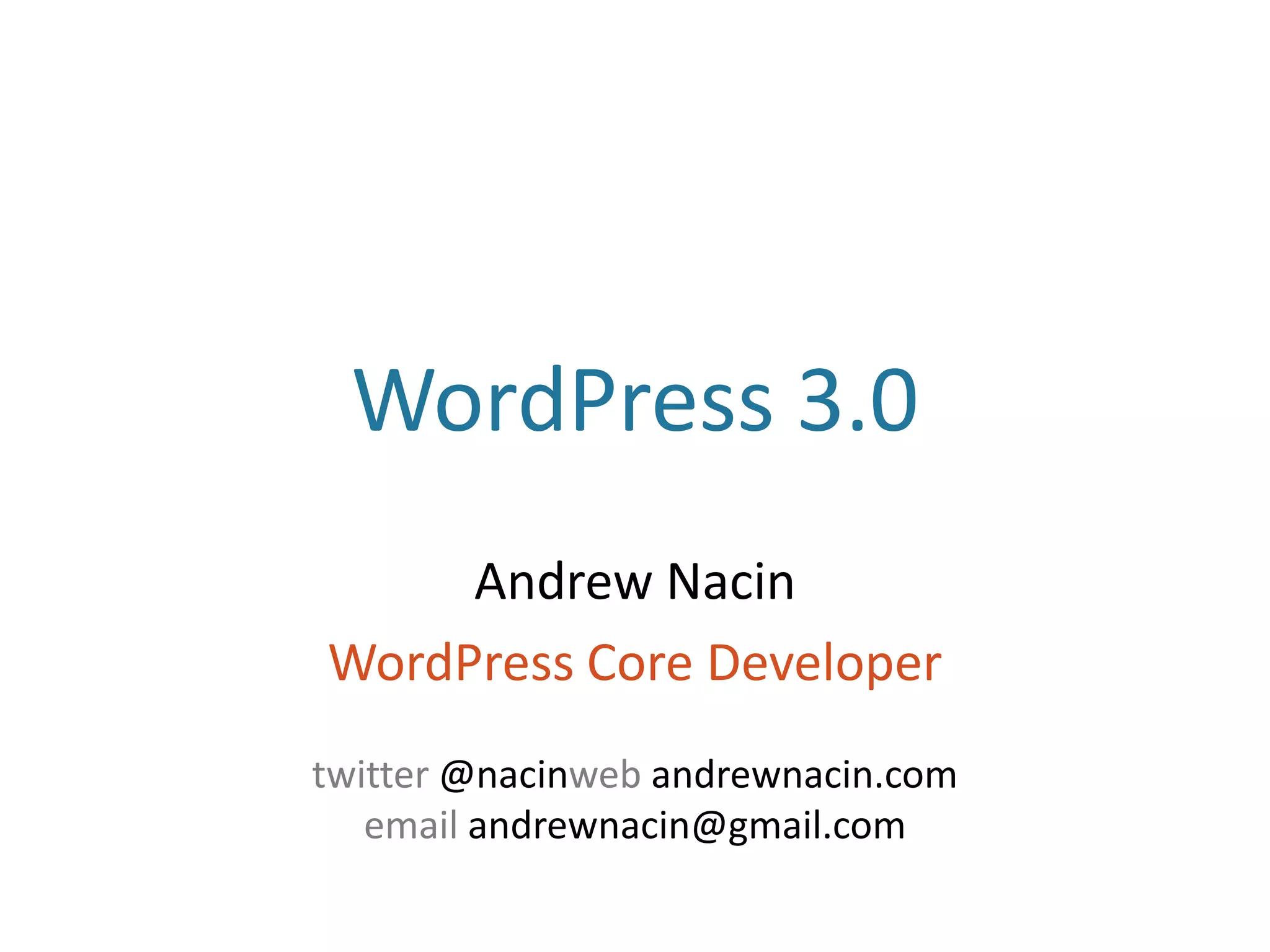 This document discusses WordPress 3.0 and the new features it includes. WordPress 3.0 allows for custom post types and taxonomies, improved theme customization options like custom headers and menus, and better integration of WordPress Multisite. It was downloaded over 12 million times in its first 9 weeks and aims to make WordPress a full content management system while maintaining its ease of use, performance, and scalability.