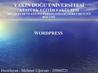 YAKIN DOĞU ÜNİVERSİTESİATATÜRK EĞİTİM FAKÜLTESİ BİLGİSAYAR VE EĞİTİM TEKNOLOJİLERİ ÖĞRETMENLİĞİ BÖLÜMÜ WORDPRESS Hazırlayan : Mehmet Uğurşan - 20060221