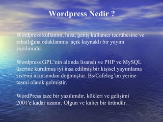 Wordpress Nedir ?Wordpress kullanım, hıza, geniş kullanıcı tecrübesine ve rahatlığına odaklanmış açık kaynaklı bir yayım yazılımıdır. Wordpress GPL’nin altında lisanslı ve PHP ve MySQL üzerine kurulmuş iyi inşa edilmiş bir kişisel yayımlama sistemi arzusundan doğmuştur. Bs/Cafelog’un yerine resmi olarak gelmiştir. WordPress taze bir yazılımdır, kökleri ve gelişimi 2001′e kadar uzanır. Olgun ve kalıcı bir üründür.