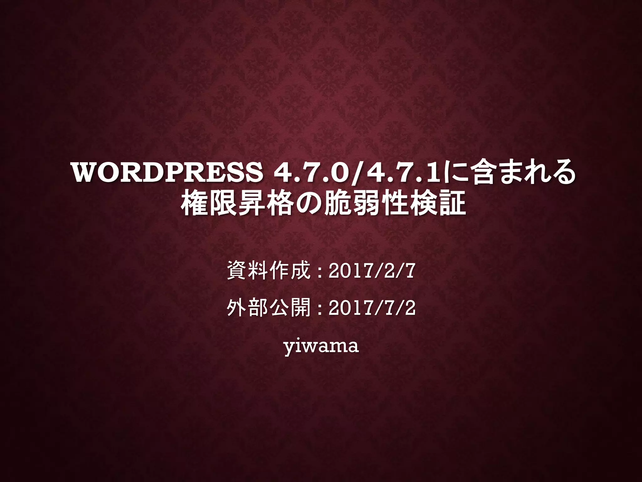 今年2月(2017年)頃に公開され、国内でも被害例を受けたWordpress 4.7.0/4.7.1の脆弱性の検証を行った資料です。