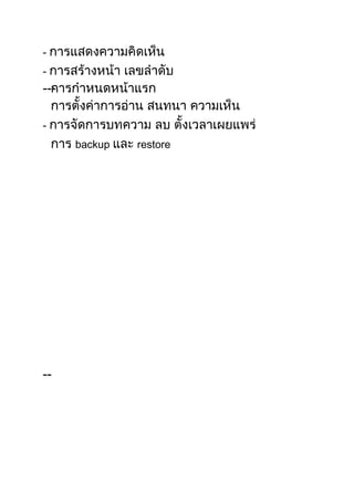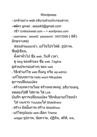 Wordpress<br />- ยกตัวอย่างweb อธิบายส่วนประกอบต่างๆ<br />- สมัคร gmail : sesa42@gmail.com<br />- เข้า Unblockweb.com -- > wordpress.com<br />- username : sesa42 password : 04272000 ( 8 ตัว อักษร+เลข)<br />- ซ่อนส่วนแนะนำ, แก้ไขโปรไฟล์ ,รูปภาพ, ชื่อผู้เขียน, <br />- ตั้งค่าทั่วไป ชื่อ web ,วันที่ เวลา, <br />- ดู blog ของตัวเอง ชื่อ web ,Tagline ดูส่วนประกอบต่างๆ ของ web<br />- วิธีเข้าแก้ไข web ที่เมนู หรือ wp-admin<br />- แก้ไขบทความ hello word กด update ดูการเปลี่ยนแปลง<br />- สร้างบทความใหม่ สร้างหมวดหมู่ ,อธิบายเมนู, ทดลองใส่สี ใส่ภาพ ใส่ Link <br /> บันทึก ดูการเปลี่ยนแปลง วิธีกลับมาแก้ไขหน้า<br />- ใส่ Vdo จาก Youtube ใส่ SlideShare<br />- สร้าง อัลบั้มภาพ สร้าง SlideShow<br />- แก้ไขรูปแบบ web เลือก Theme <br />- widget รูปภาพ, ข้อความ, ปฏิทิน, สถิติ, link, <br />- การแสดงความคิดเห็น<br />- การสร้างหน้า เลขลำดับ<br />- การกำหนดหน้าแรก<br />- การตั้งค่าการอ่าน สนทนา ความเห็น<br />- การจัดการบทความ ลบ ตั้งเวลาเผยแพร่<br />- การ backup และ restore<br />