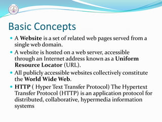 The document provides an overview of basic web concepts, including definitions of websites, web servers, HTTP, and the role of web browsers. It introduces HTML, CSS, and dynamic web pages, discussing content management systems like WordPress. Additionally, it outlines various methods for earning money online and highlights the importance of free and open-source software.