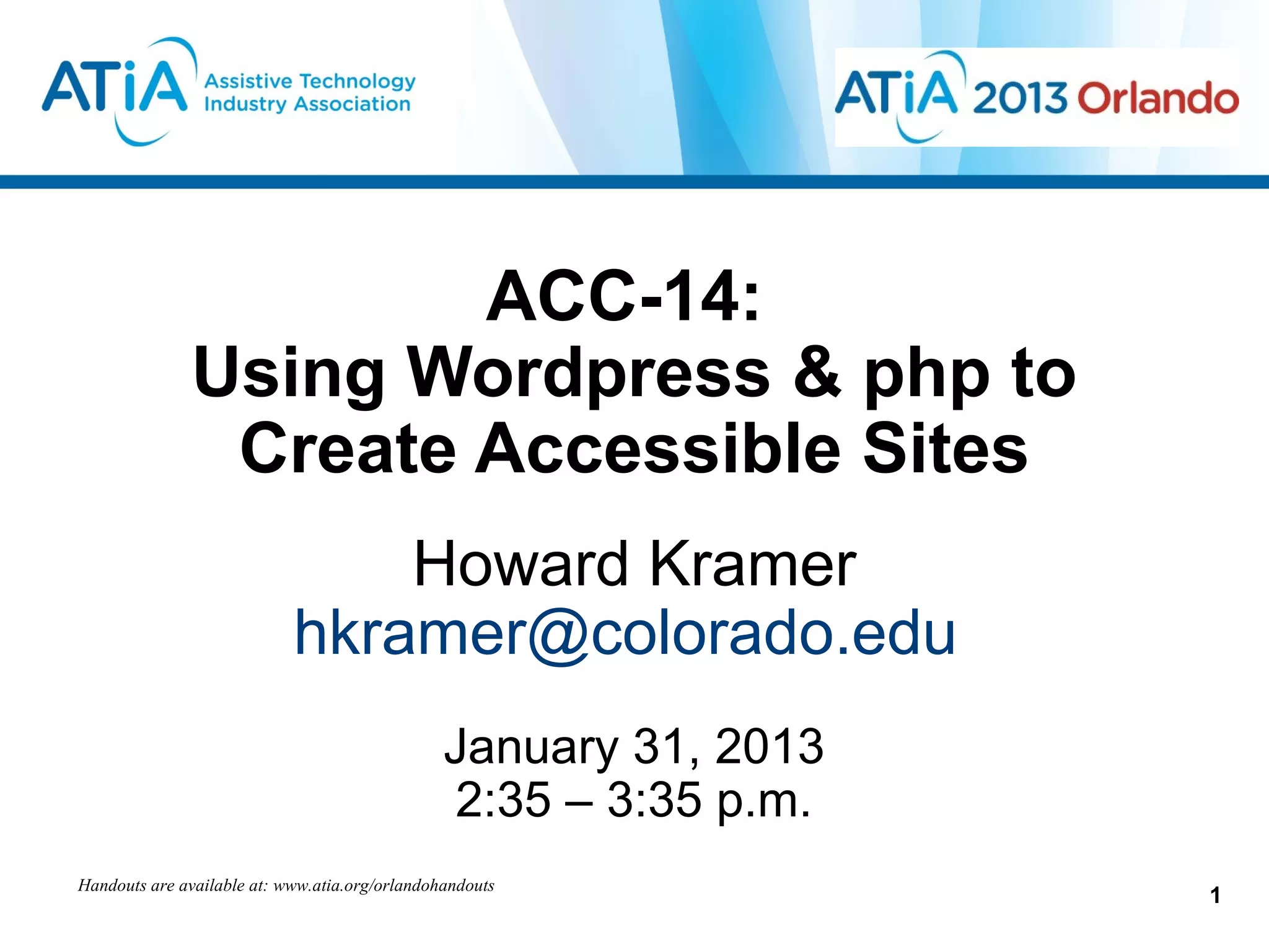 This document summarizes Howard Kramer's presentation on using WordPress and PHP to create accessible websites. Kramer discussed some of the common accessibility issues with WordPress themes and plugins, including that many themes do not pass WCAG 2.0 and plugins have little quality control. He provided resources for finding more accessible themes and plugins, like the WP Accessible project. Kramer also reviewed new accessibility features in WordPress 3.5 and resources for learning more about developing with WordPress.