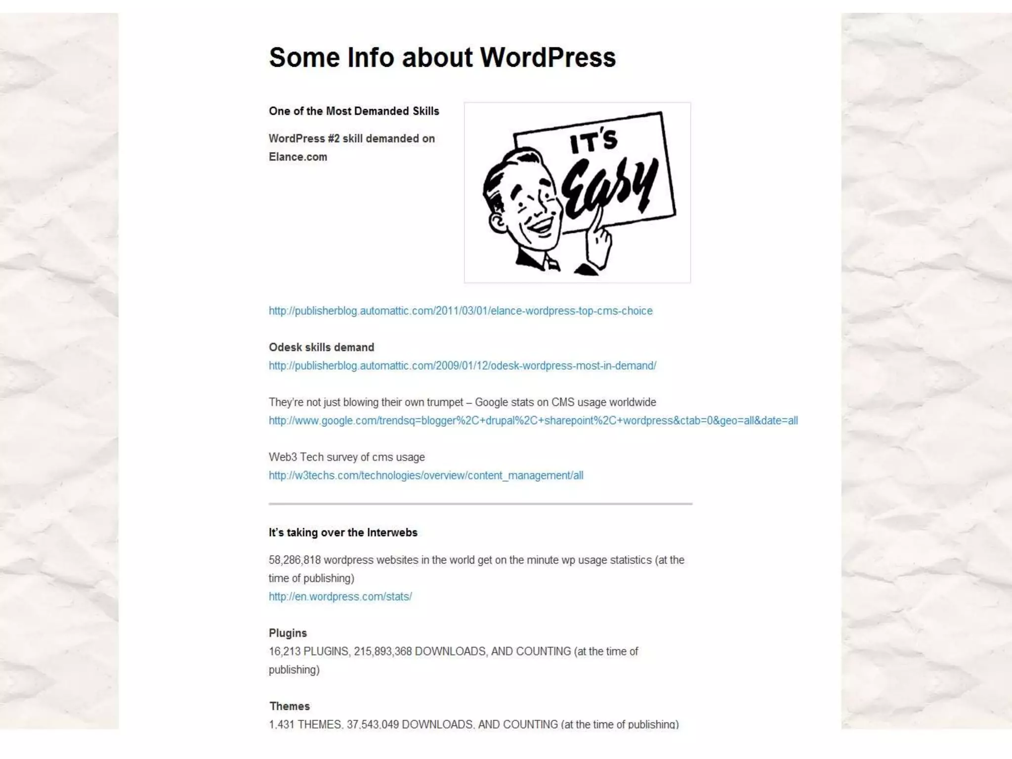 his will cover a quick introduction on WordPress as a CMS, the advantages attached to it, achieving basic requirements of a website easily and quickly using already existing plugins, themes and basic customization of existing themes that do not require any coding. It will basically be trying to show the simplicity of WordPress and the power it has. I will also highlight the SEO capacities within WordPress and why anyone looking to market themselves on the web should go to WordPress as a platform of choice. I will also cover a little on achieving complex websites using WordPress without much coding.