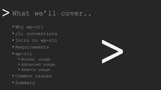 This document provides an in-depth guide on wp-cli, a command-line interface for managing WordPress installations. It discusses installation requirements, basic and advanced usage, remote command execution, and common troubleshooting issues. The document concludes by emphasizing wp-cli's effectiveness for managing WordPress tasks and encourages users to explore its capabilities.