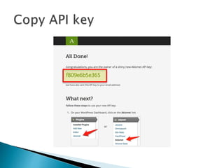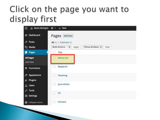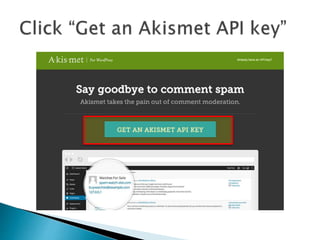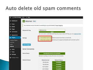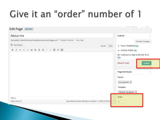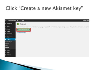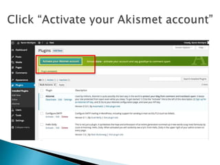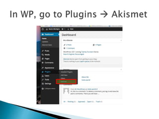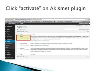 The document provides instructions for managing a WordPress site, including dealing with comment spam by installing the Akismet plugin. It outlines how to reorder pages by assigning 'order' numbers and updating the site accordingly. Additionally, it explains the use of widgets to customize the site's sidebar content.
