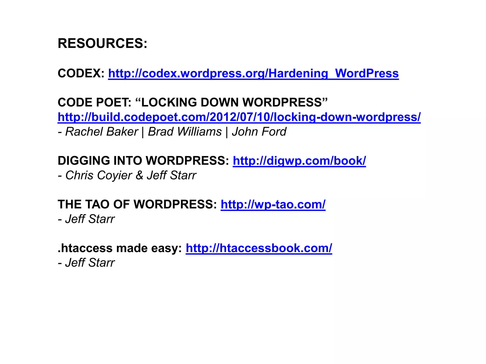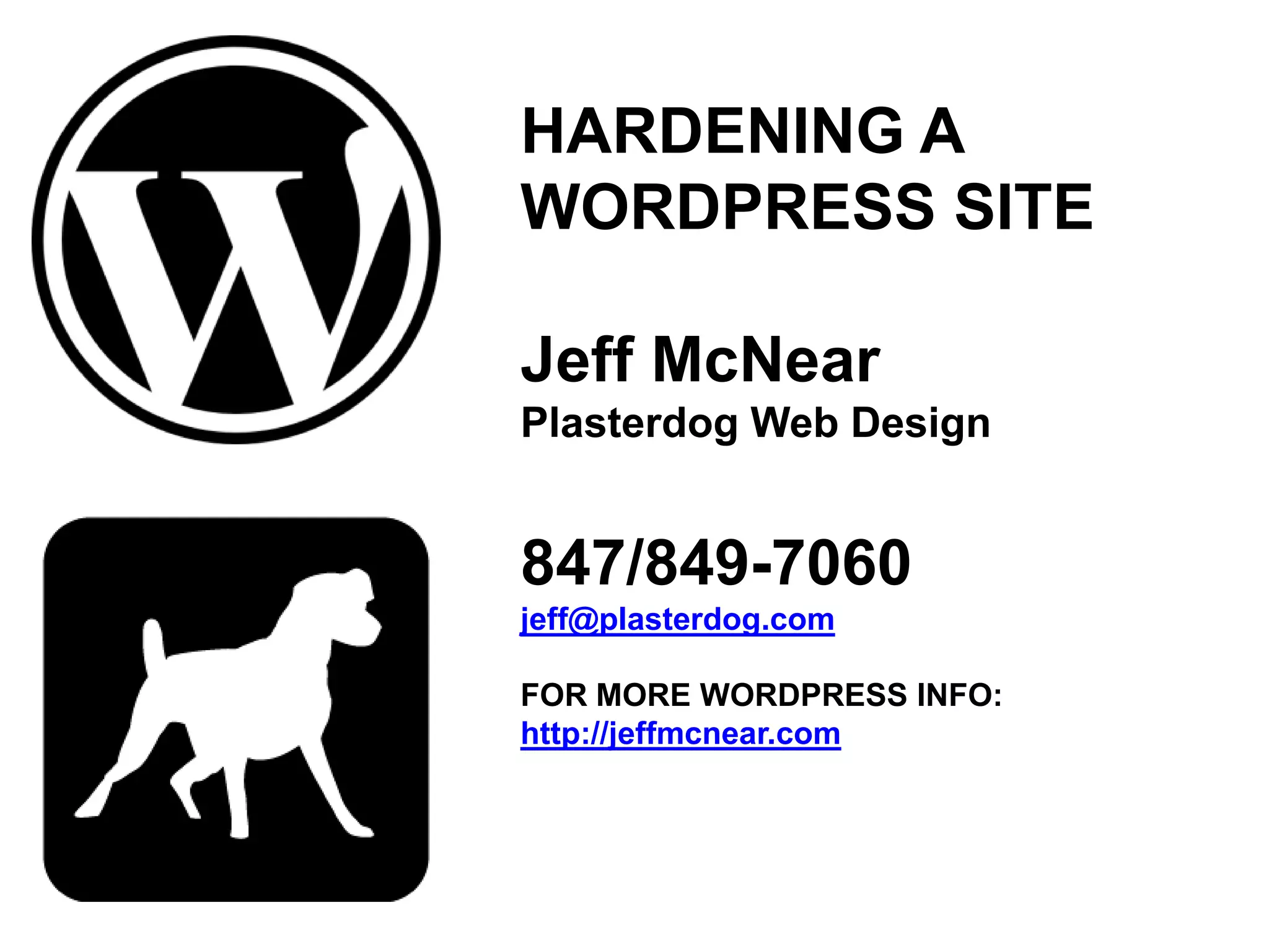 This document provides tips and recommendations for hardening a WordPress site against hacking and security threats. It discusses typical paths of infection like insecure server configurations or outdated code. It recommends various security measures including keeping backups, using strong passwords, updating software regularly, and restricting access to admin areas and important files. It also suggests security plugins that can help scan sites for vulnerabilities, limit login attempts, backup data, and more. The document emphasizes that while no site is completely hack-proof, administrators can make sites much more difficult to compromise through diligent security practices.