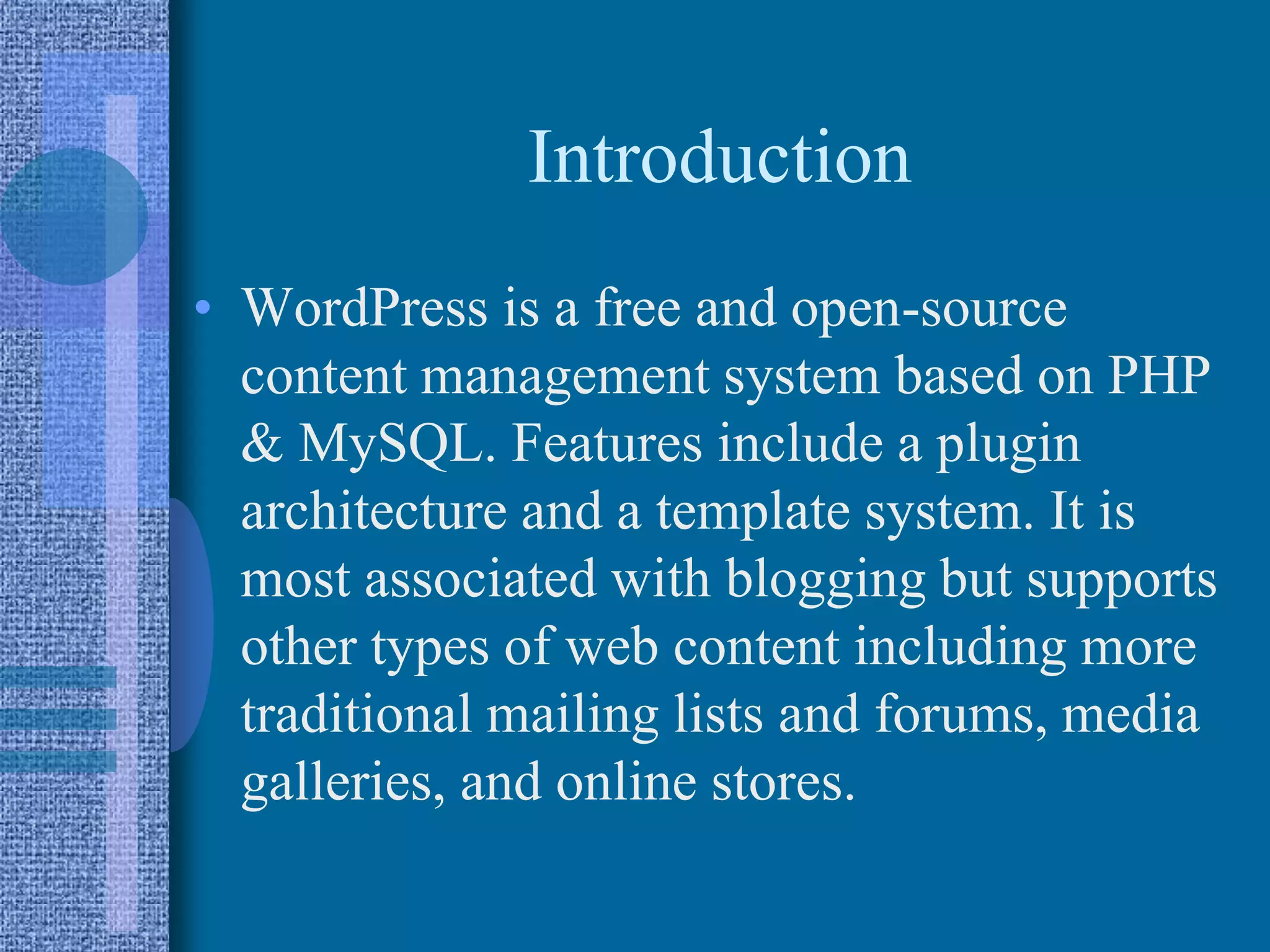 Wordpress is a free and open-source content management system based on PHP and MySQL. It allows users to build customizable websites or blogs with thousands of plugins and themes available. Some key benefits of Wordpress include its flexibility to adapt to changing needs through plugins, ease of use even for beginners, variety of theme options, ability to extend functionality with plugins, and high search engine rankings.