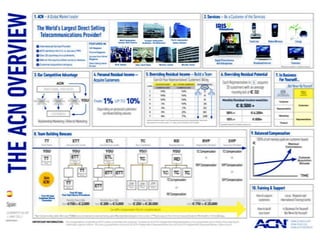 ACN is a global direct selling company operating in 23 countries across 4 continents. It provides telecommunications and home services to customers through independent representatives. Representatives can earn residual income from customer billing as well as bonuses from building a team. ACN offers initial and ongoing training and support to representatives to help them acquire customers and grow their business. Success depends on the individual efforts of representatives and income is not guaranteed.