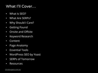 The document provides an overview of SEO (Search Engine Optimization), covering essential aspects such as algorithms, SERPs, site visibility, keyword research, and content structure. It emphasizes the importance of optimizing both onsite and offsite elements to improve website traffic and user engagement. Additionally, it offers tools and resources for effective SEO practices, encouraging the creation of high-quality, shareable content.