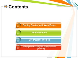 The document is an outline for a WordPress online training course covering key topics such as blogging basics, WordPress administration, site design, and marketing strategies for blogs. It includes instructions on setting up user accounts, managing posts, installing themes and plugins, and enhancing blog interactivity. Additionally, it provides insights on SEO optimization and monetizing blogs.