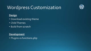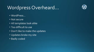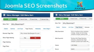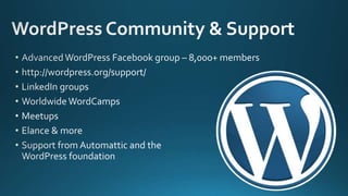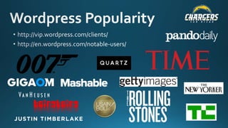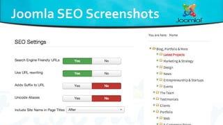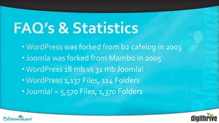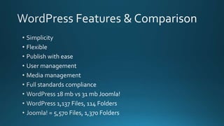 This document provides information about content management systems (CMS) and compares Joomla and WordPress. It notes that CMS platforms like Joomla and WordPress make it easy for non-technical users to manage website content. It then lists popular CMS platforms and notes that WordPress is used by 60.5% of all websites with a CMS platform while Joomla is used by 22.7% of all websites. The document goes on to describe customization, security and community support options for Joomla websites.
