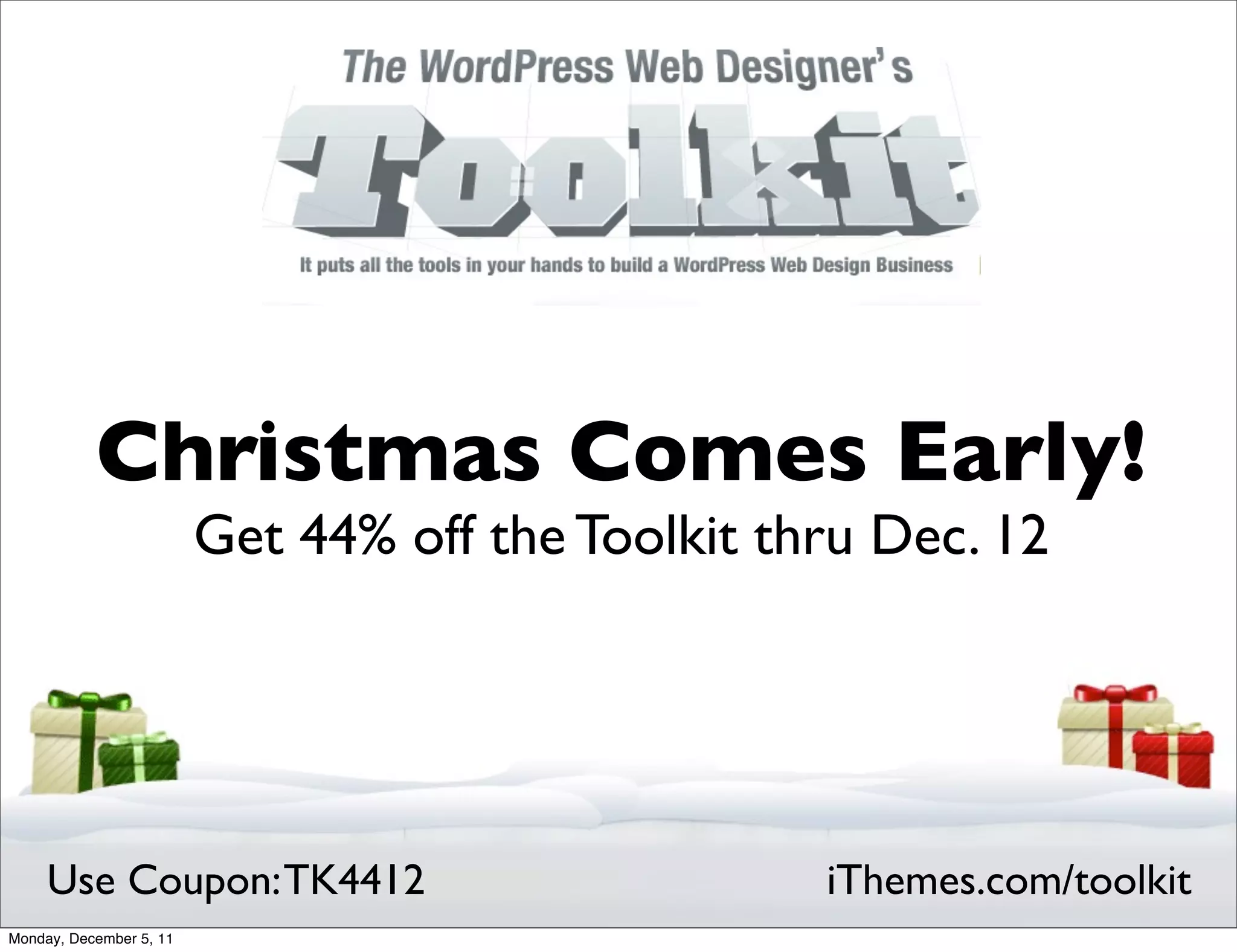 The document advertises that the iThemes Toolkit is available with a 44% discount until December 12th using coupon code TK4412. The Toolkit includes over 150 themes, 20 plugins, 300+ hours of training, and is positioned as the perfect gift for web designers or do-it-yourselfers. It provides designers with the latest tools to build and manage WordPress websites.