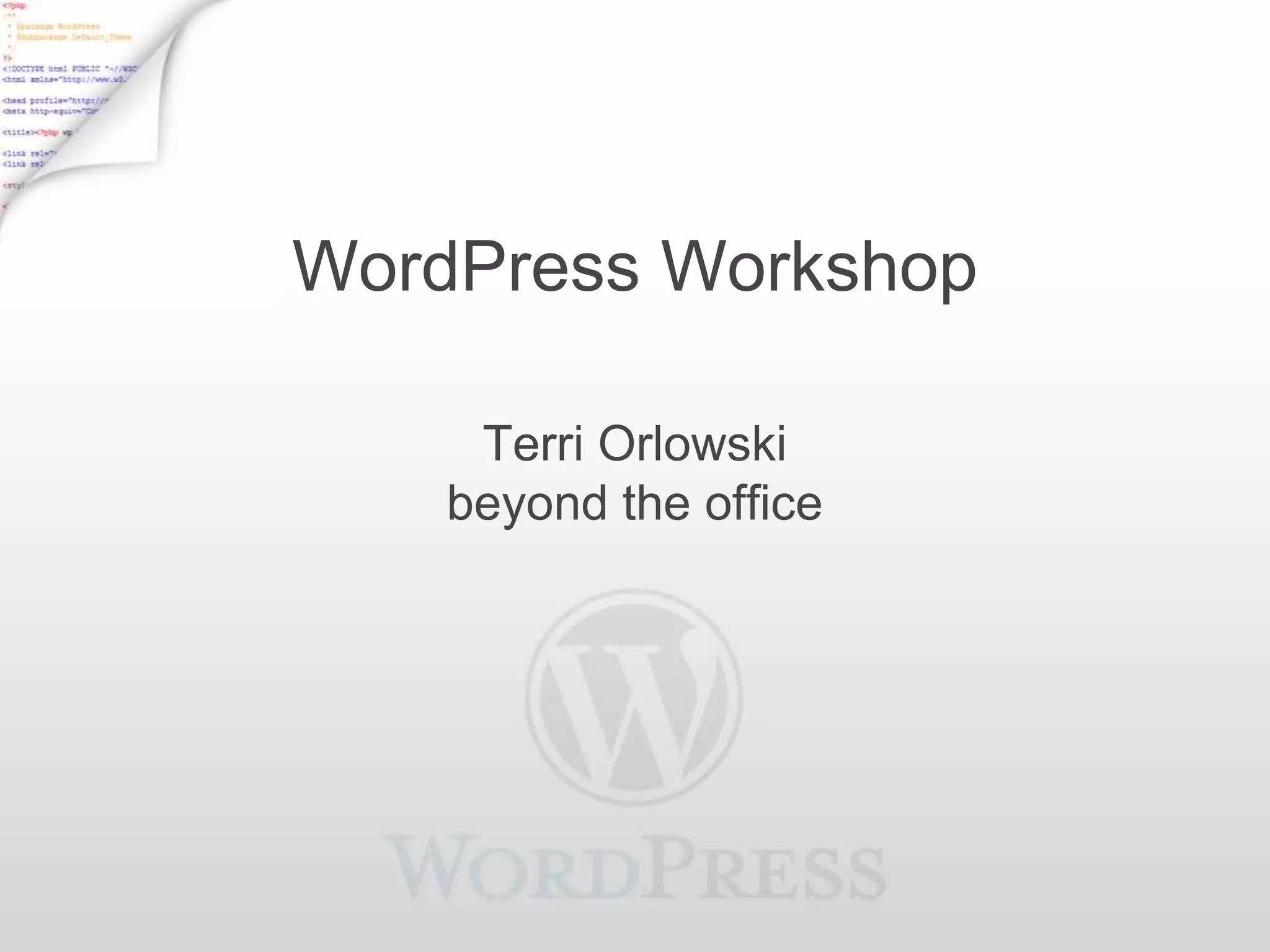 This document summarizes a WordPress workshop presented by Terri Orlowski. The workshop covered an introduction to WordPress, how to install WordPress manually or via one-click installation, important security practices, useful plugins for backups, security and other functions, themes, and various ways WordPress can be used like for podcasts, newsletters, and more. The workshop provided information to help attendees understand and get started using WordPress.