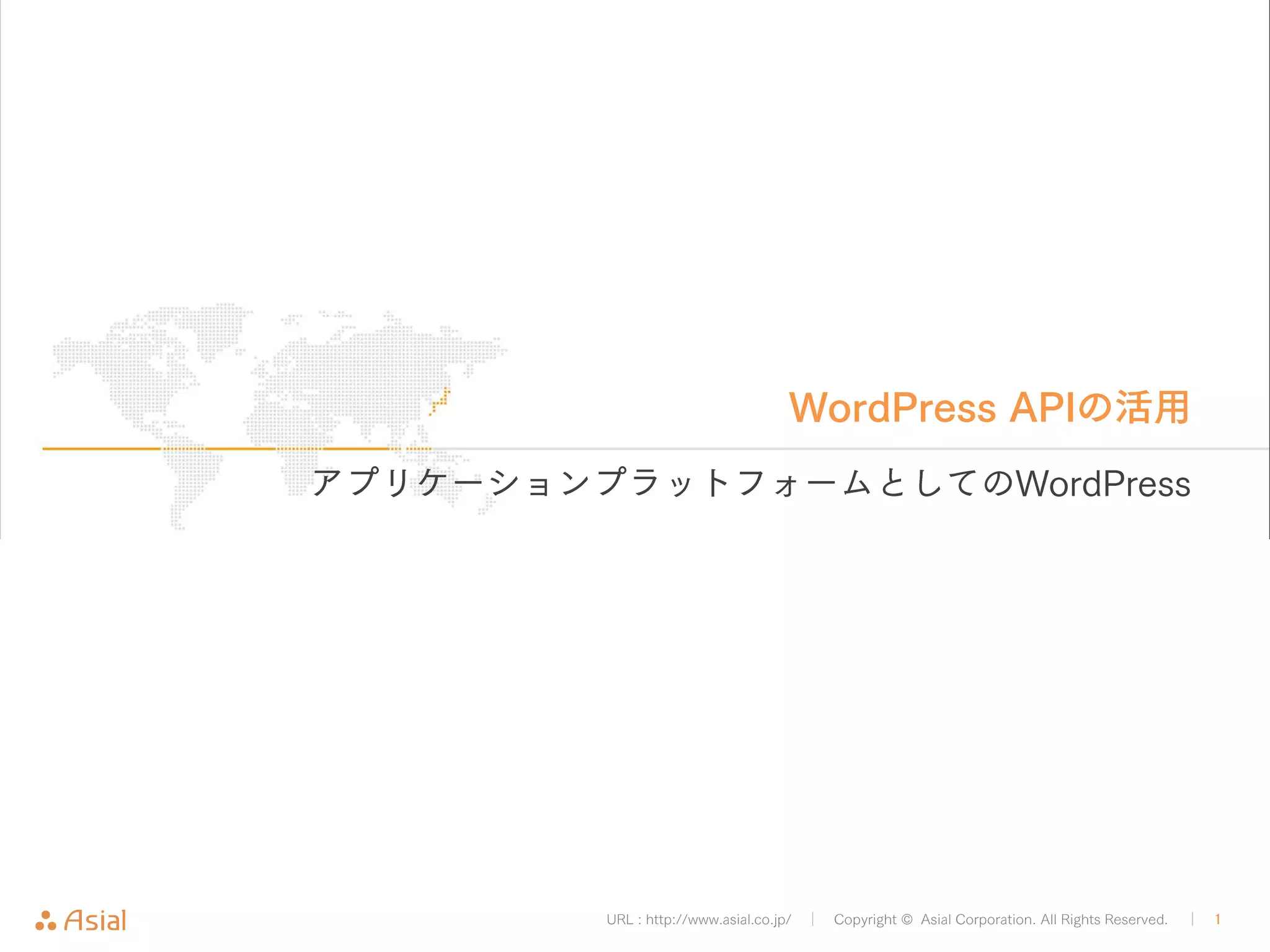 URL : http://www.asial.co.jp/ │ Copyright © Asial Corporation. All Rights Reserved. │ 21 „ XML-RPCとJSON REST API • コンテンツの入出力を行うAPIは一つではない 9 昔からあるもの – XML-RPC » 枯れてる » XML-RPCというやり方で通信を行う » データはXMLで返ってくる 9 最近開発中の物 – JSON REST API » 開発中 » REST というやり方で通信を行う » データはJSONで返ってくる 9 その他 – 各種プラグイン – JetPackのREST API