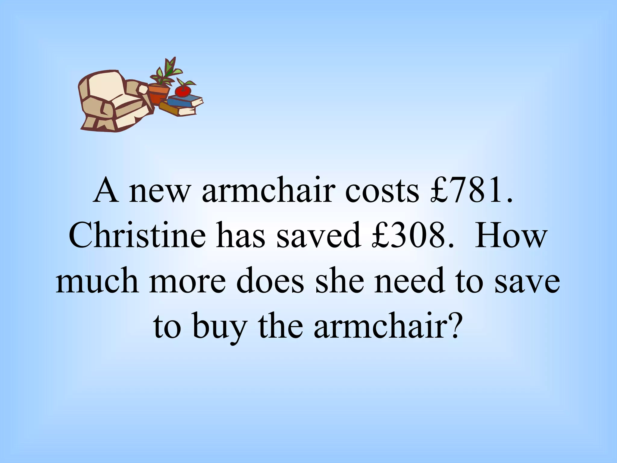 The document states that a new armchair costs £781, and Christine has saved £308. To determine how much more Christine needs to save to buy the armchair, the document uses a number line to count up from £308 to £781, determining that the difference is £473.