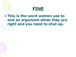 This document provides definitions for common phrases used during arguments between men and women. It lists 8 phrases or terms: fine, five minutes, nothing, go ahead, loud sigh, that's okay, thank you, and don't worry, I got it. For each one it gives a brief explanation of what the phrase means from a woman's perspective during an argument.