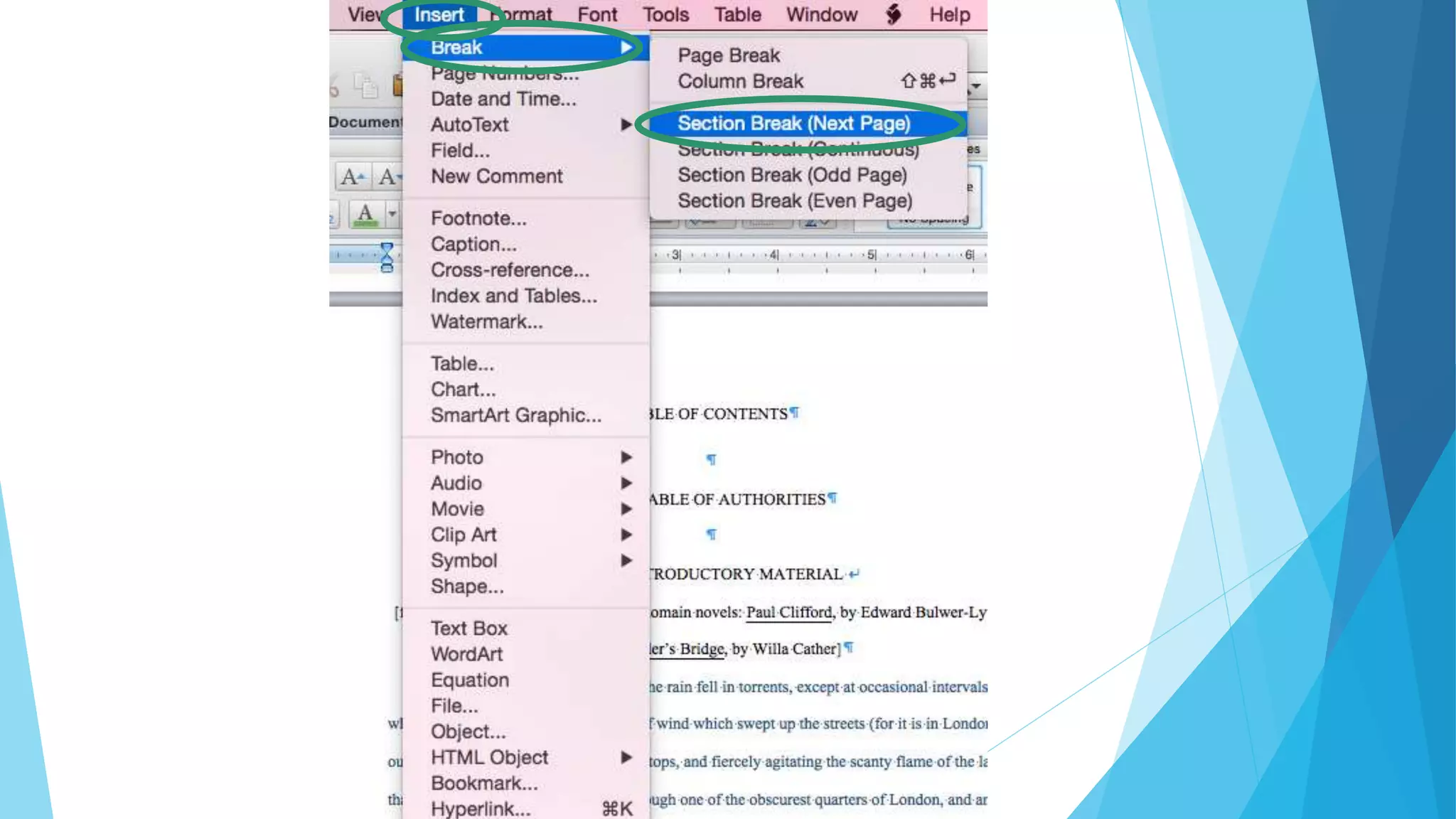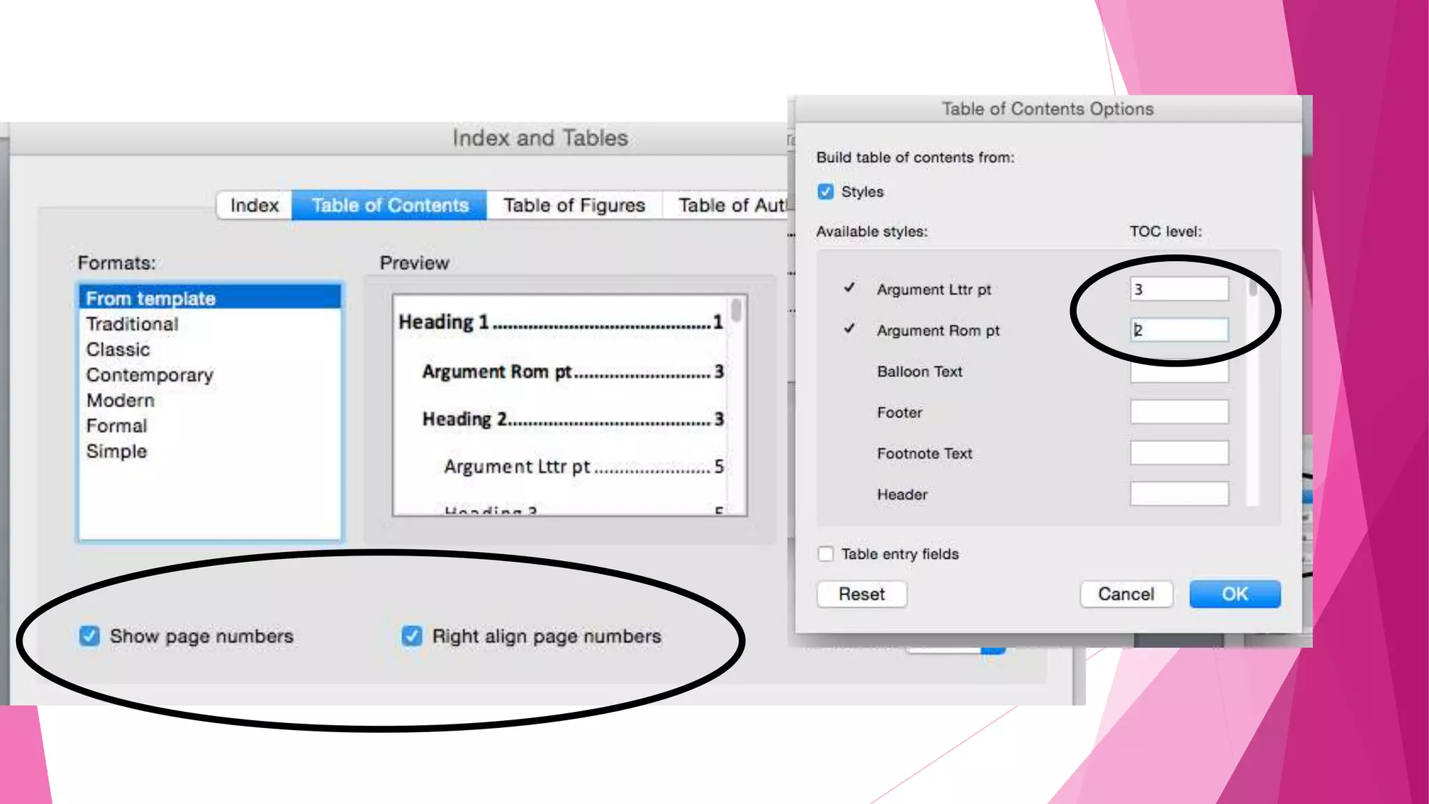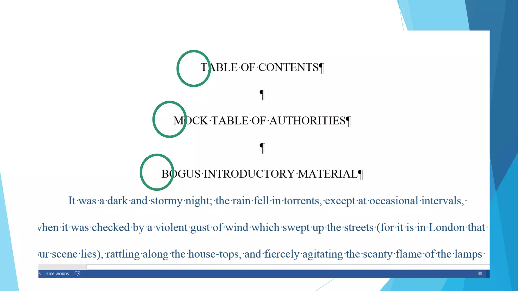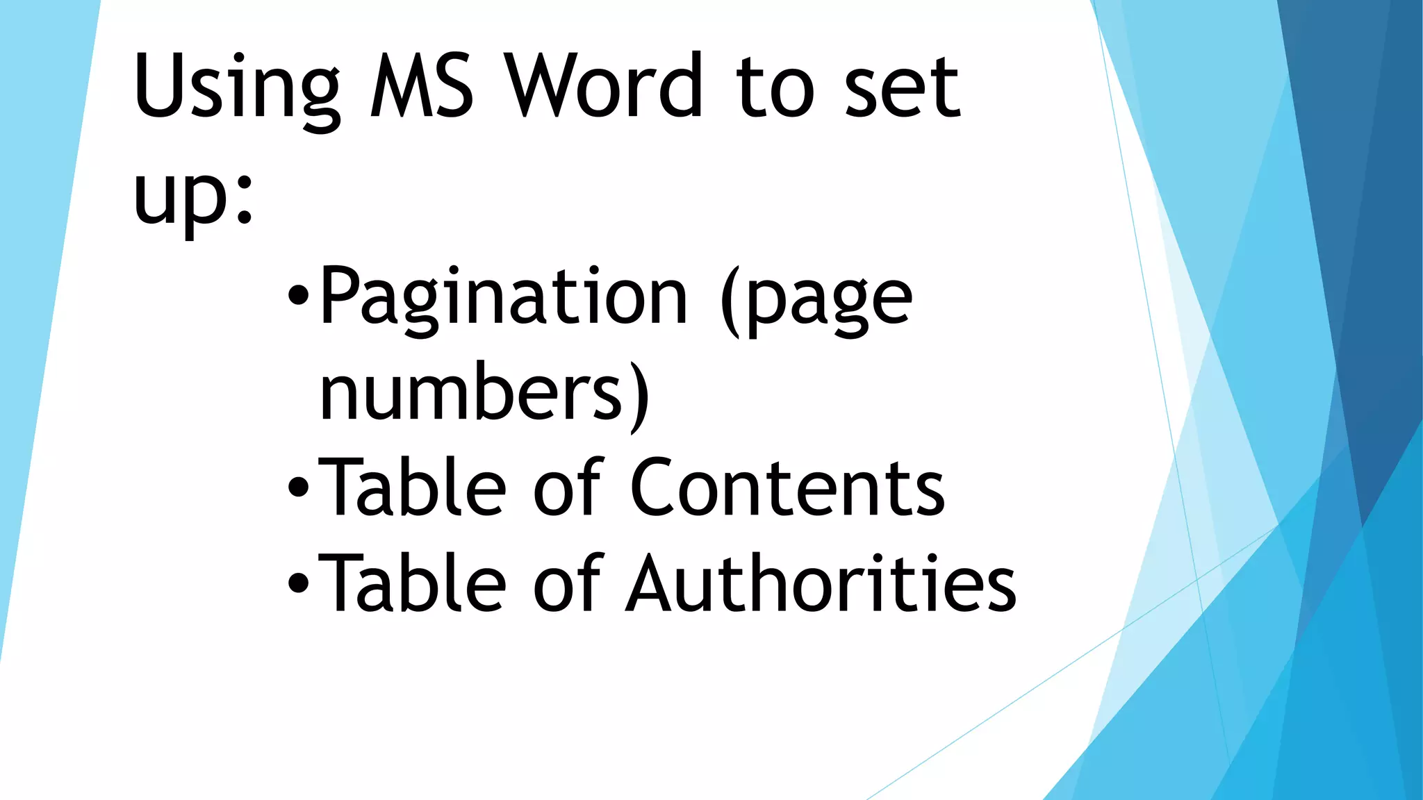 This document provides instructions for setting up pagination, a table of contents, and a table of authorities in Microsoft Word. It describes inserting section breaks, formatting page numbers, applying styles to headings, generating the table of contents automatically, marking citations, and generating the table of authorities. The steps include setting up headers, footers, page numbers, applying heading styles, generating the table of contents, searching for and marking citations, and generating the table of authorities.