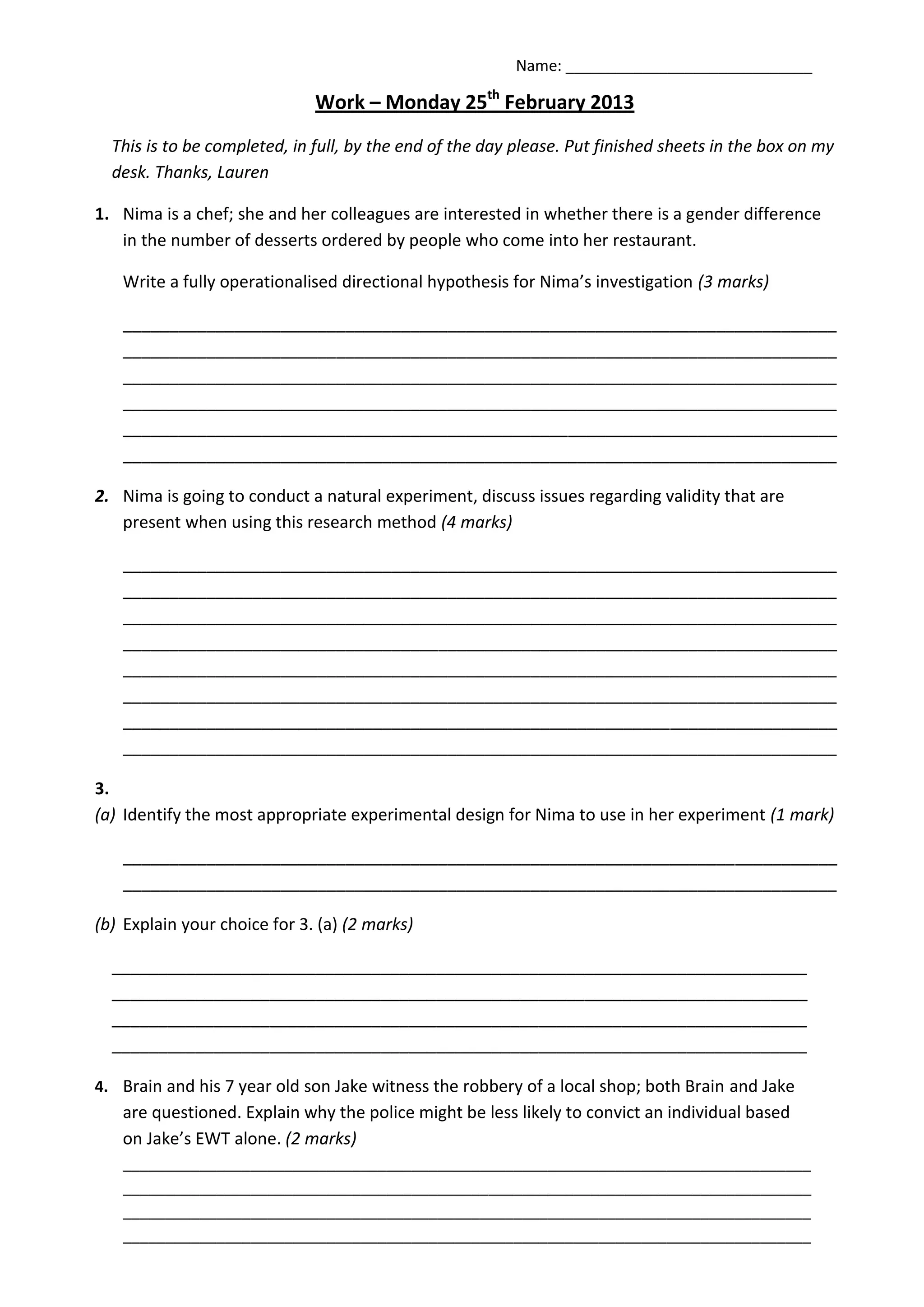 Nima is a chef investigating whether there is a gender difference in dessert orders at her restaurant. She plans to conduct a natural experiment to study this, which has issues with validity that must be addressed. The most appropriate design for her study would be an experimental design, allowing her to control variables and draw causal conclusions. Eyewitness testimony from a child like Jake may be less reliable for convicting someone due to issues with children's memory and suggestibility.