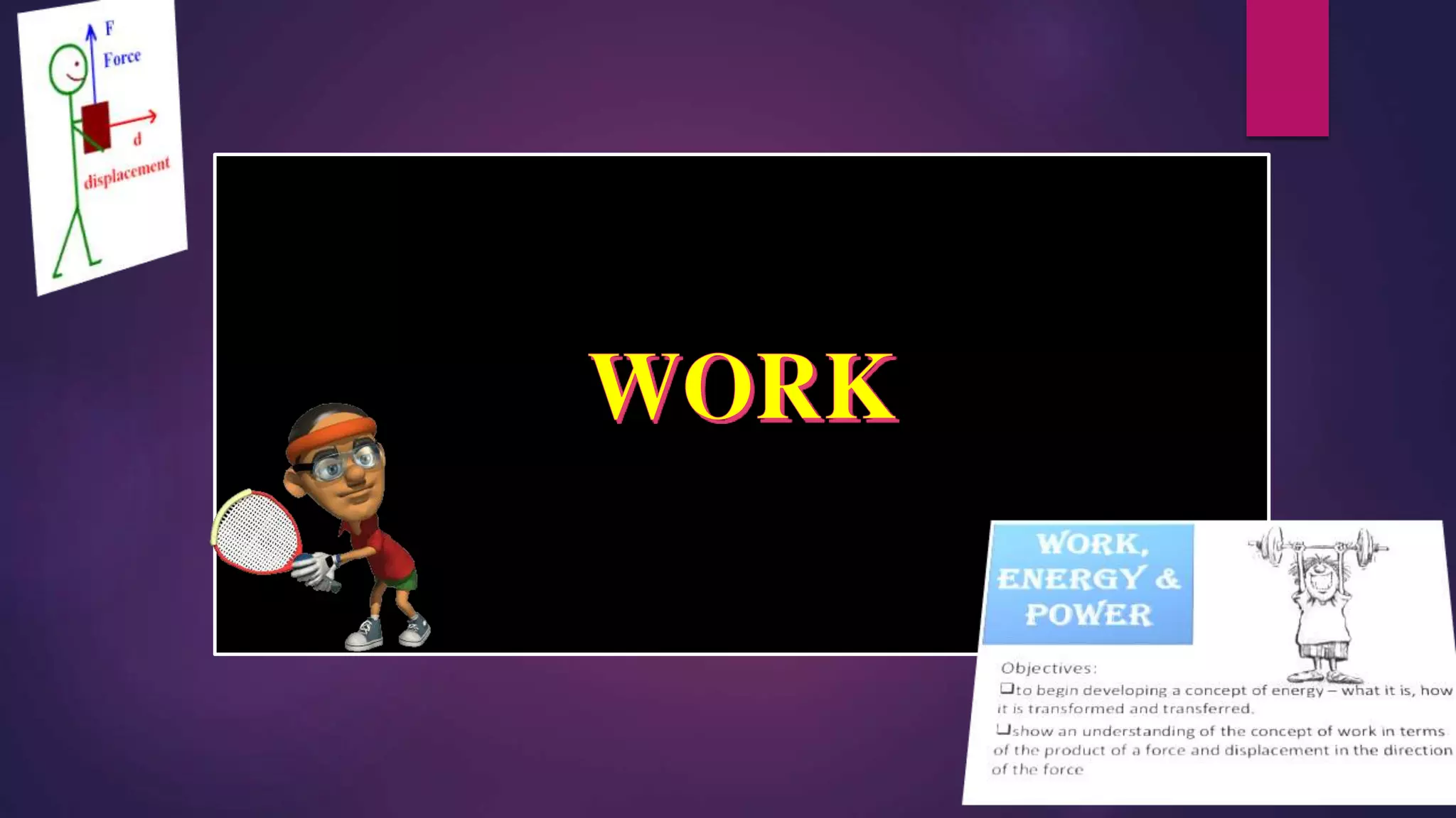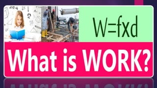 Work is defined as a force causing an object to move over a distance parallel to the force. The SI unit for work is the joule, which is equal to 1 newton-meter. Work is measured by multiplying the applied force by the displacement distance. Examples of work include lifting a weight off the ground and pushing a heavy cart over a distance.