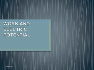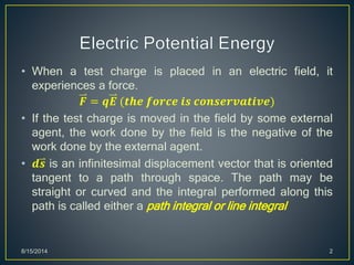 The document summarizes key concepts about electric potential and electric potential energy. It defines electric potential as the work required per unit charge to move a charge from a reference point to its current position in an electric field. Electric potential energy is defined as stored energy in a charge-field system due to the charges' positions. The document outlines how electric potential and potential energy relate to work, electric fields, and voltage. It also discusses applications of these concepts, including conductors, equipotential surfaces, and the Bohr model of the hydrogen atom.