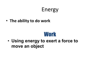The document discusses different types of energy: - Work is done when a force causes an object to move, and is calculated as work (W) equals force (F) multiplied by distance (d). - Kinetic energy is the energy of motion and is calculated as kinetic energy (KE) equals one-half mass (m) multiplied by velocity (v) squared. - Potential energy is stored energy due to an object's position or state, such as height, and is calculated as potential energy (PE) equals mass (m) multiplied by gravity (g) multiplied by height (h).