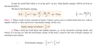 The document discusses the concepts of work, power, and energy in the context of physics, particularly focusing on mechanical energy. It defines work as the product of force and displacement, while also distinguishing between potential energy, kinetic energy, and strain energy. Additionally, it provides examples of calculations related to the kinetic energy and angular acceleration of various mechanical systems.