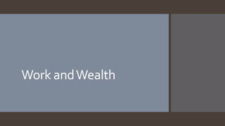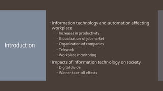 This document discusses how information technology and automation are affecting work and wealth. It notes that while automation has destroyed some manufacturing and clerical jobs, it has also created new jobs as increased productivity boosts demand. There is debate around whether AI and robots will take over most jobs. The rise of telework and temporary contract work has made long-term employment at a single company less common. Globalization has increased competition but also outsourced some jobs. The digital divide separates those with access to technology from those without, and a winner-take-all phenomenon concentrates wealth among a few top performers.