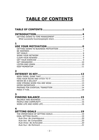 This document is a comprehensive guide on time management for work-at-home business owners, emphasizing the importance of motivation, organization, and balance. It provides practical strategies and techniques designed to enhance productivity and overall success in managing both business and personal life. Key topics include setting achievable goals, finding inspiration, and leveraging networking to maintain motivation and effectiveness in work.
