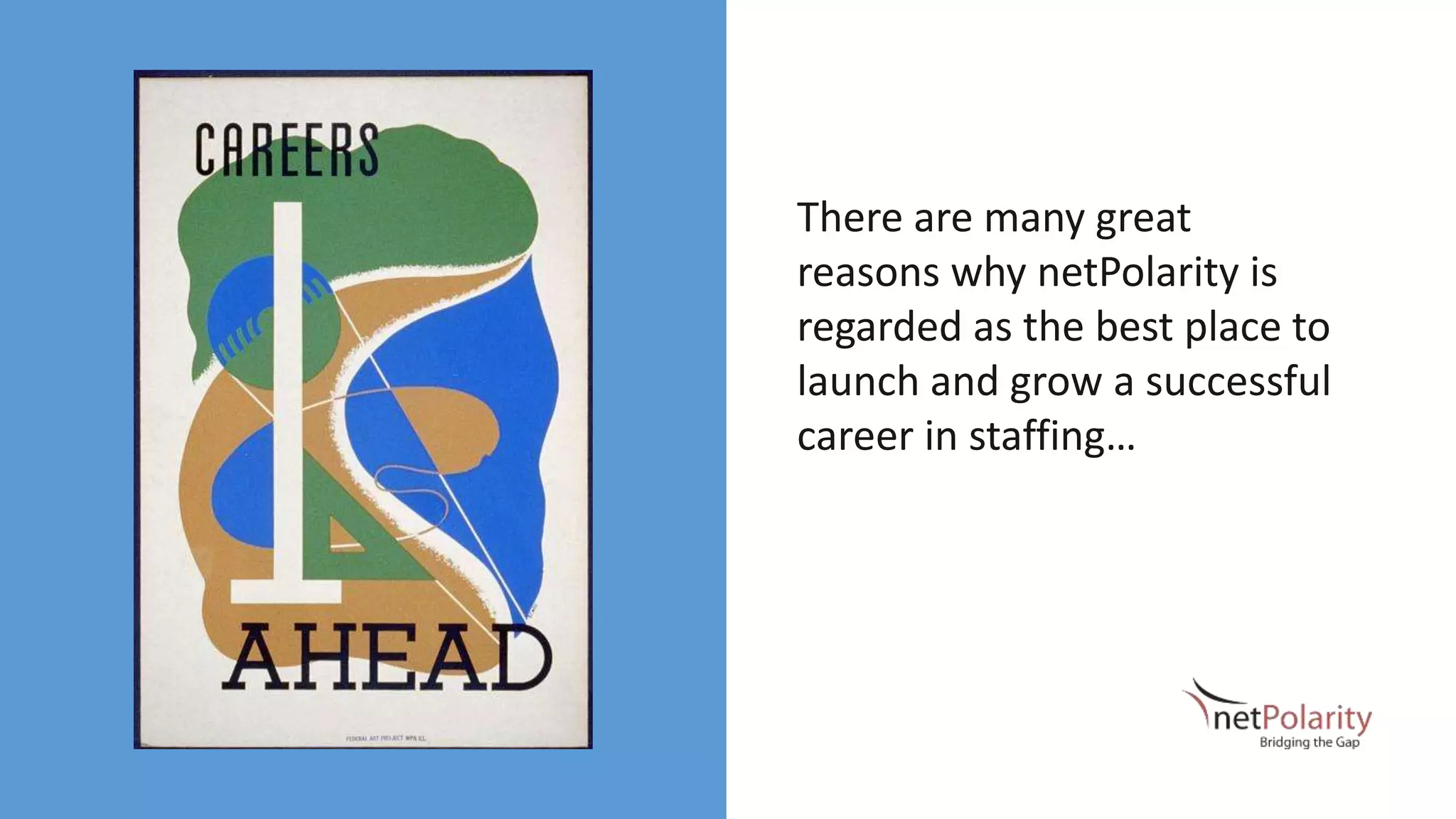 This document summarizes why netPolarity is regarded as the best place to launch and grow a career in staffing. It states that netPolarity invests in its people through industry-leading training programs. It also provides fulfilling work with a variety of clients and industries. netPolarity fosters career advancement and takes a stake in each employee's professional development and promotion. It provides opportunities for entrepreneurship by supporting independent teams. netPolarity celebrates performance, measures success with metrics, and recognizes the importance of work-life balance.
