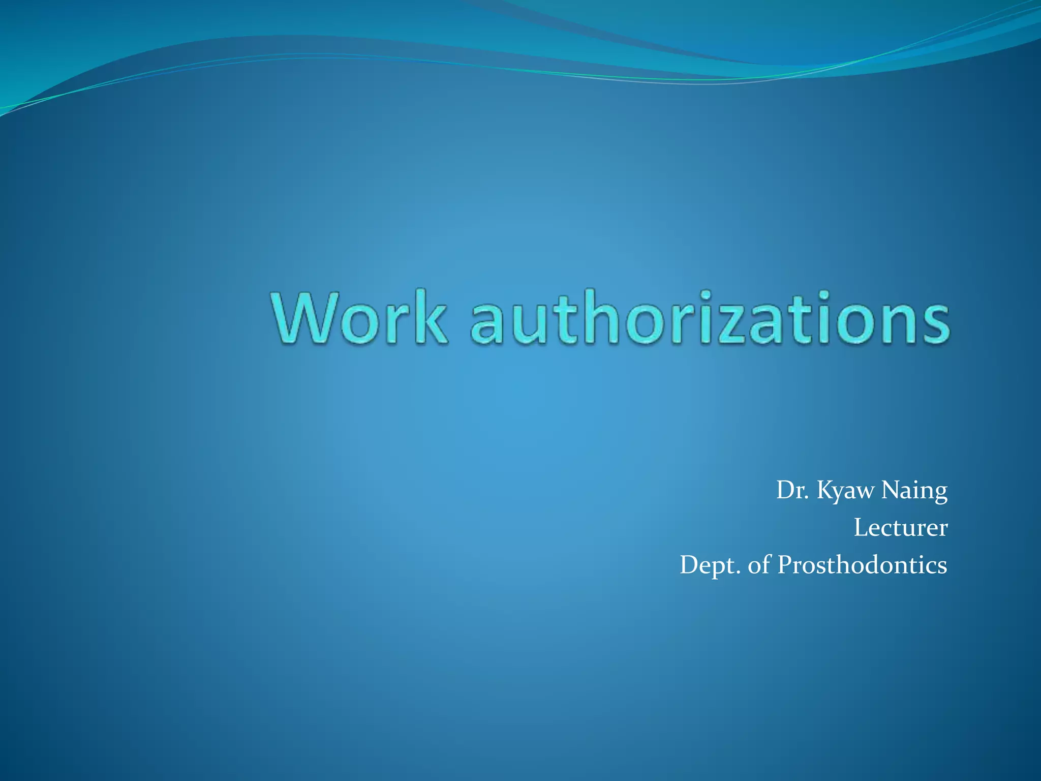 3) The work authorization delineates responsibilities between the dentist and technician, protects against illegal practice, and aids in resolving disputes.