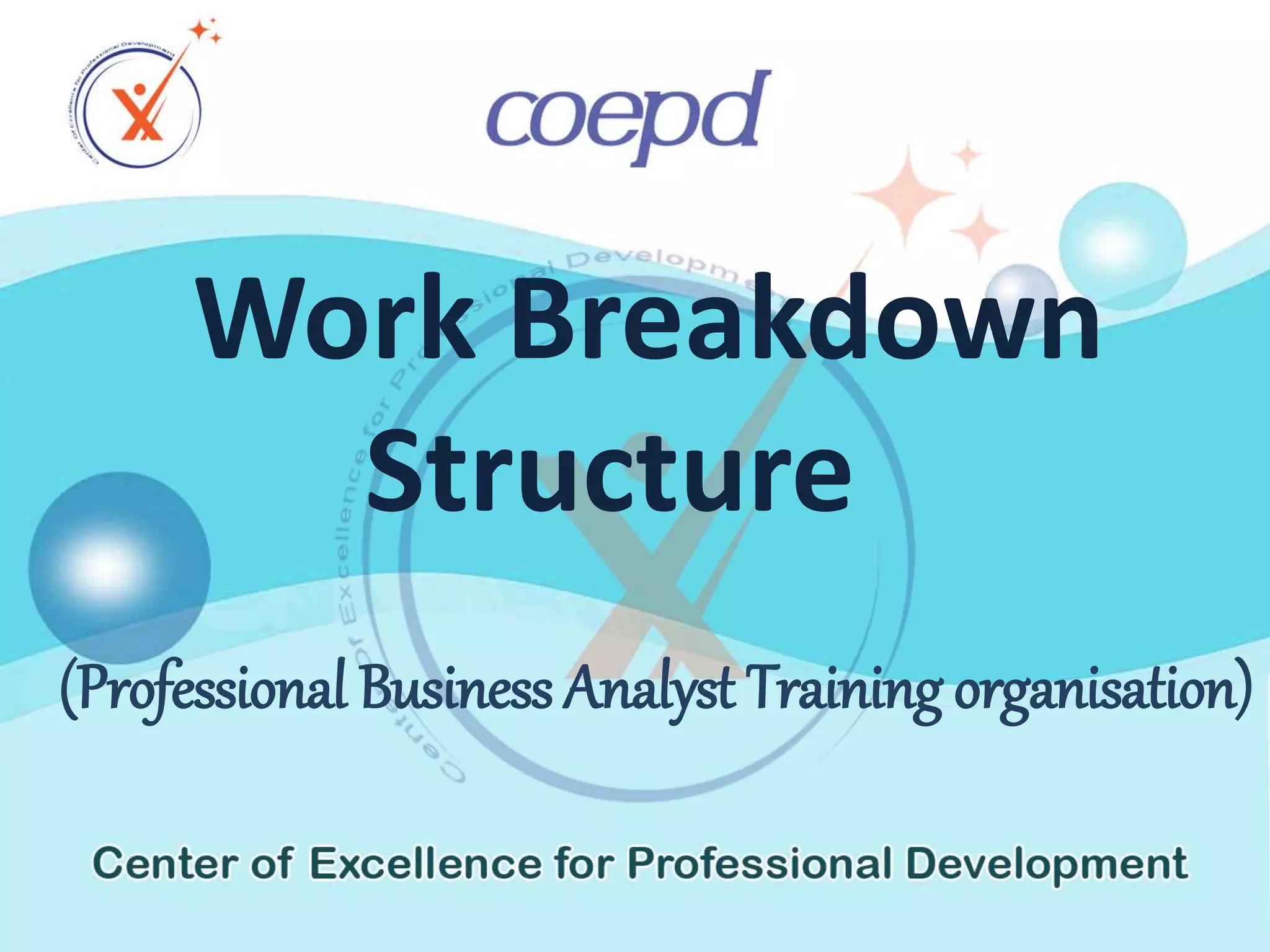 A work breakdown structure (WBS) is a technique for breaking down complex projects into manageable tasks, enhancing project organization and efficiency. It involves identifying main deliverables, subdividing them into tasks and work packages, and adhering to specific rules regarding task duration. The WBS produces various outputs, including comprehensive documentation that aids in resource estimation and stakeholder communication.