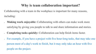 When asked about working effectively with others, it refers to how well one interacts and collaborates with colleagues and supervisors. It involves understanding group culture, shared values, and the need for joint planning and team decisions. Team collaboration is important as it can make work more enjoyable, complete tasks faster by dividing work, encourage diverse ideas, increase innovation, improve adaptability, and engage employees by involving them in company goals. Traits of effective team members include communication, empathy, flexibility, inclusion, listening, patience, respect, and trust. The best ways to work effectively in a team are to provide clear feedback, give proper credit, take responsibility, understand strengths, learn time management, know boundaries, set a good example, have a