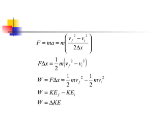 - Work is the transfer of energy due to a force over a distance. It is related to energy by work-energy theorems.