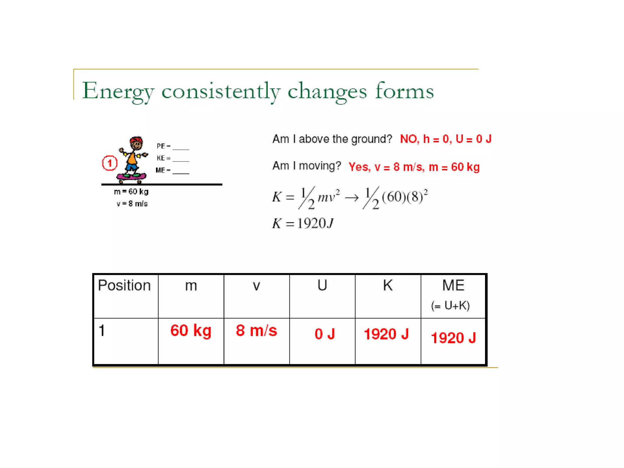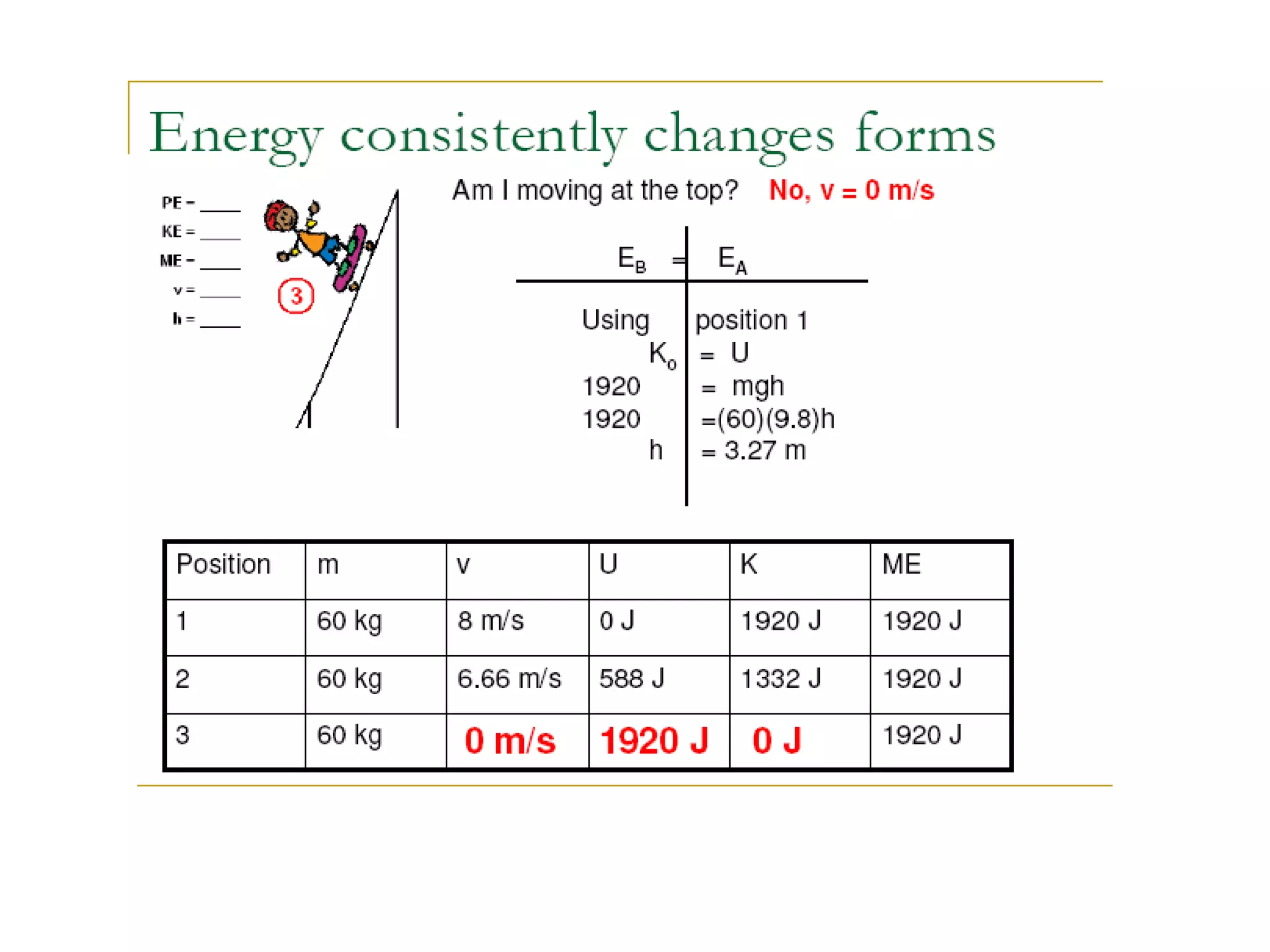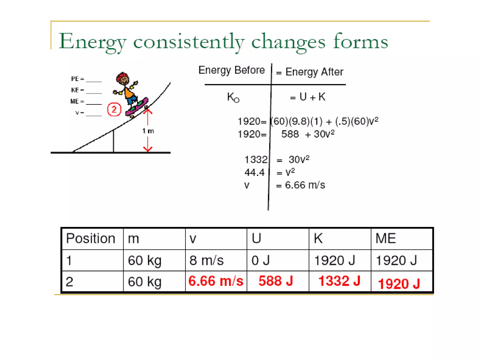 This document discusses basic energy concepts including work, kinetic energy, potential energy, and the law of conservation of energy. It provides equations to calculate work (W=FΔx), kinetic energy (KE=1/2mv^2), and gravitational potential energy (GPE=mgh). Examples are given to demonstrate calculating energy transformations during events like a swing or skydiving fall. The key points are that energy cannot be created or destroyed, only transformed between kinetic and potential forms, and this transformation can be represented using energy bar charts. Power is also defined as the rate of energy transfer or transformation (P=ΔE/Δt or P=W/Δt).