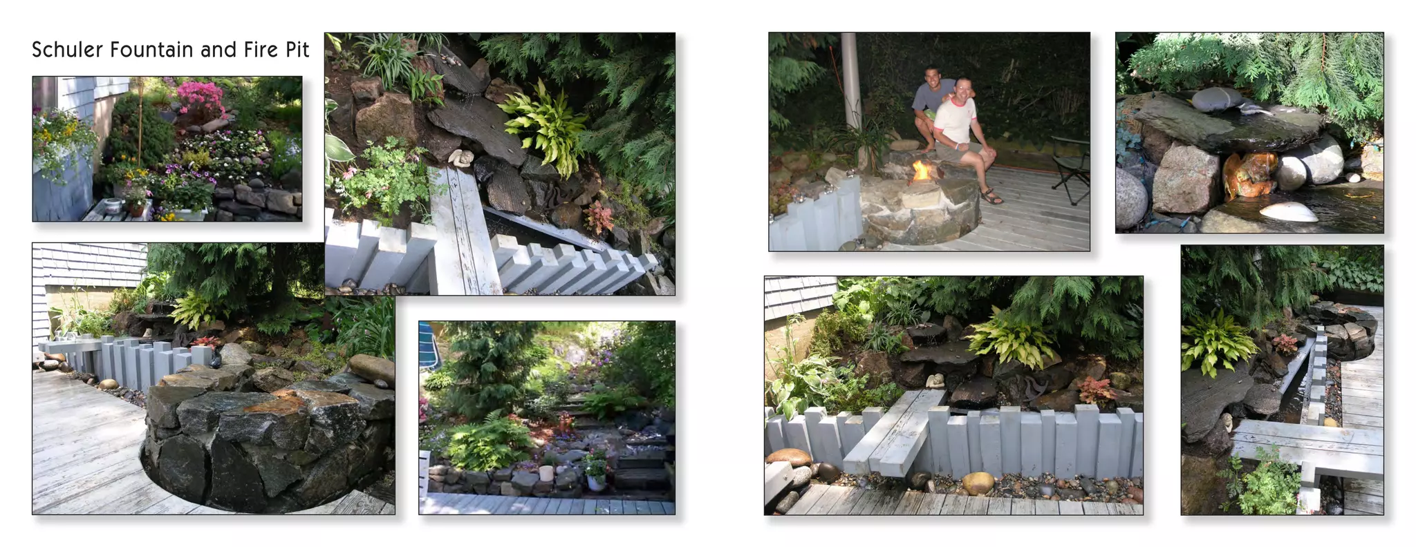 This document discusses four different outdoor water features: Schuler Fountain and Fire Pit, Lautner Fire Pit, Leal's Fountain, and Sledge Fountain Fix. It appears to be a list of products related to outdoor fountains and fire pits that may need repair or installation.