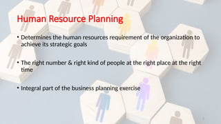 The document outlines the processes involved in human resource planning and the significance of job analysis in defining roles and responsibilities within an organization. It emphasizes the need for accurate demand and supply forecasting methods, workflow design, and job design to enhance efficiency and motivation in the workplace. Additionally, it discusses the components of job descriptions and specifications to ensure the right candidates are selected and trained effectively.