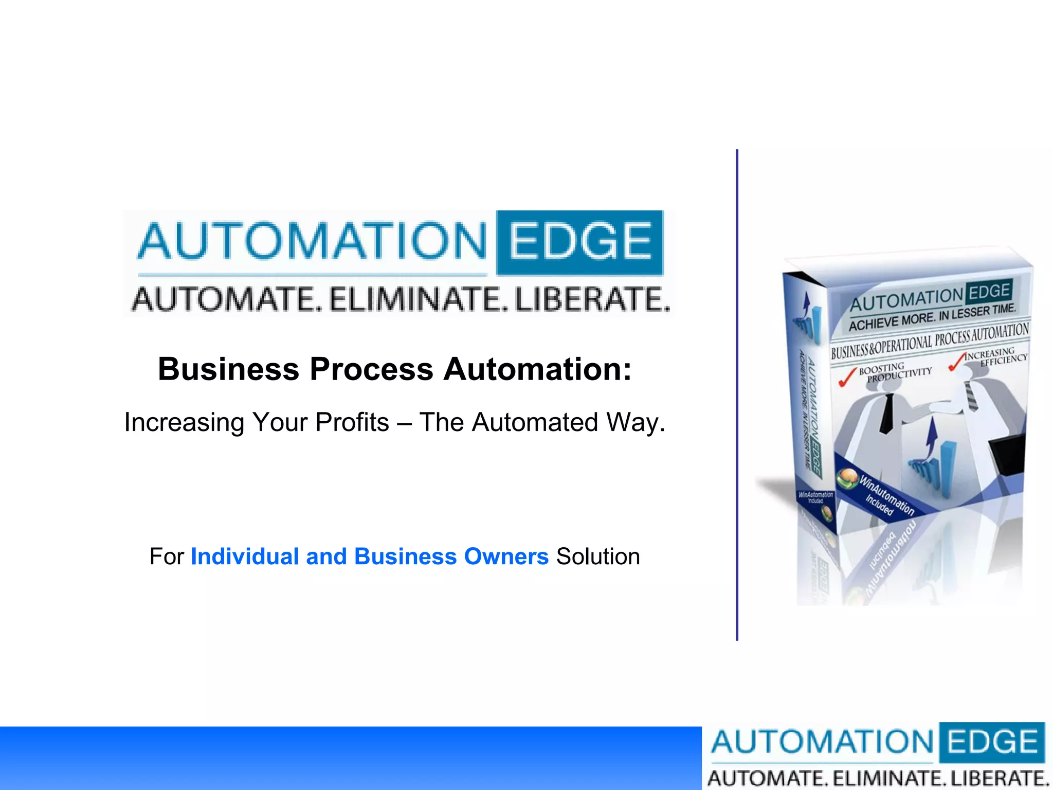 The document discusses business process automation (BPA) as a means to enhance profitability by streamlining repetitive and labor-intensive workflows. It outlines a three-pronged approach to BPA that focuses on people, software, and processes, emphasizing the importance of minimizing human involvement in well-defined tasks. The document also provides various examples and workflows demonstrating how automation can save time, reduce errors, and facilitate operational efficiency.